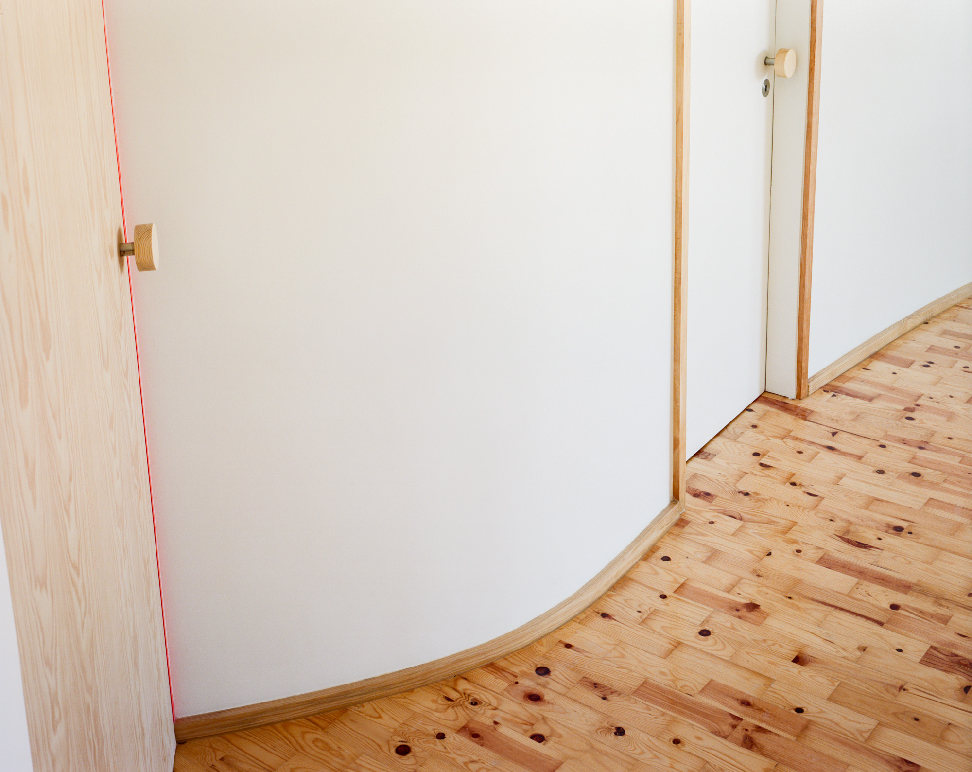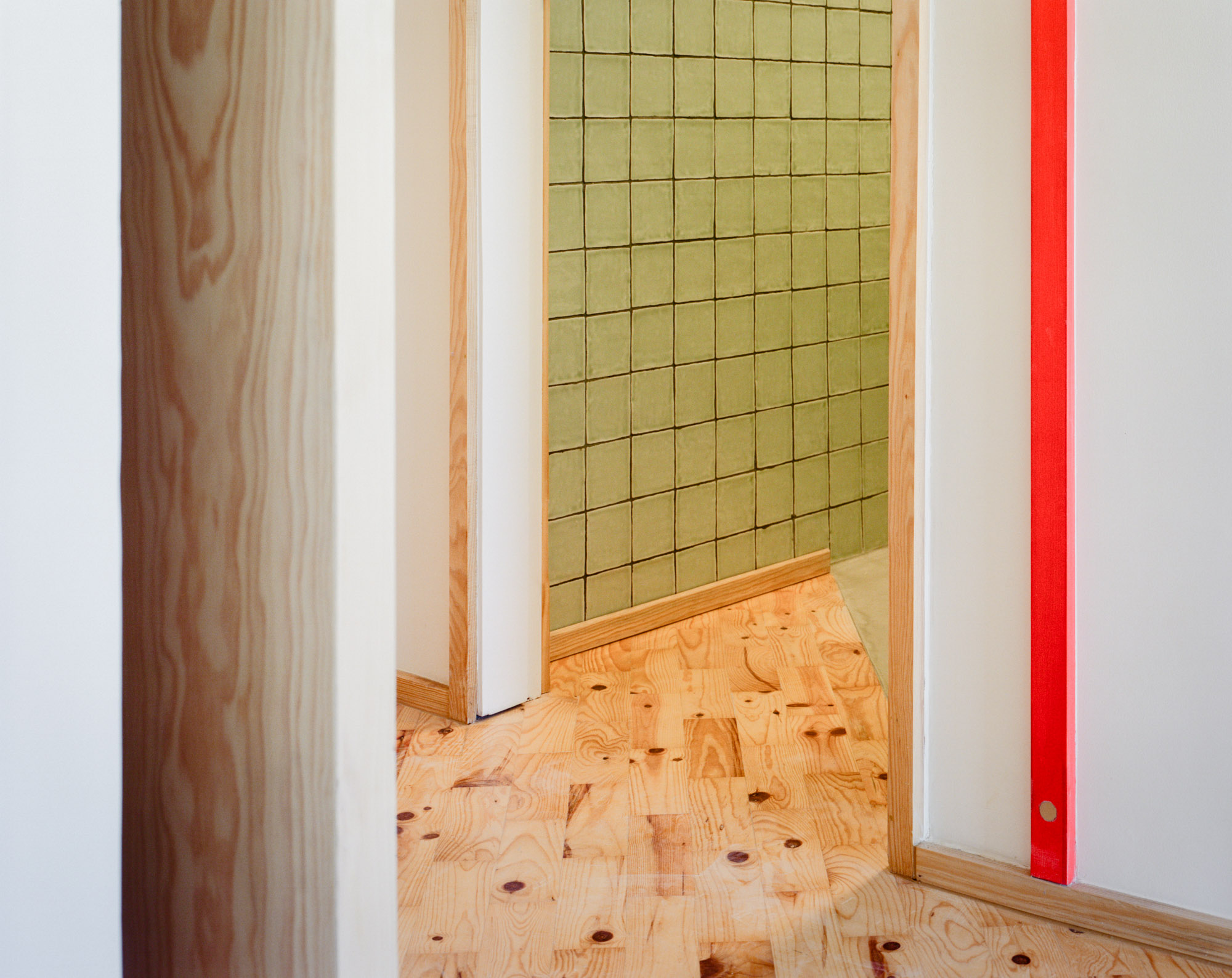 The wooden flooring, installed according to the oblique angle of the building’s own structure, subtly guides the gaze and reinforces spatial continuity. The new façade, generously open, amplifies the natural light and extends the interior into the exterior, making light the main element of the design.