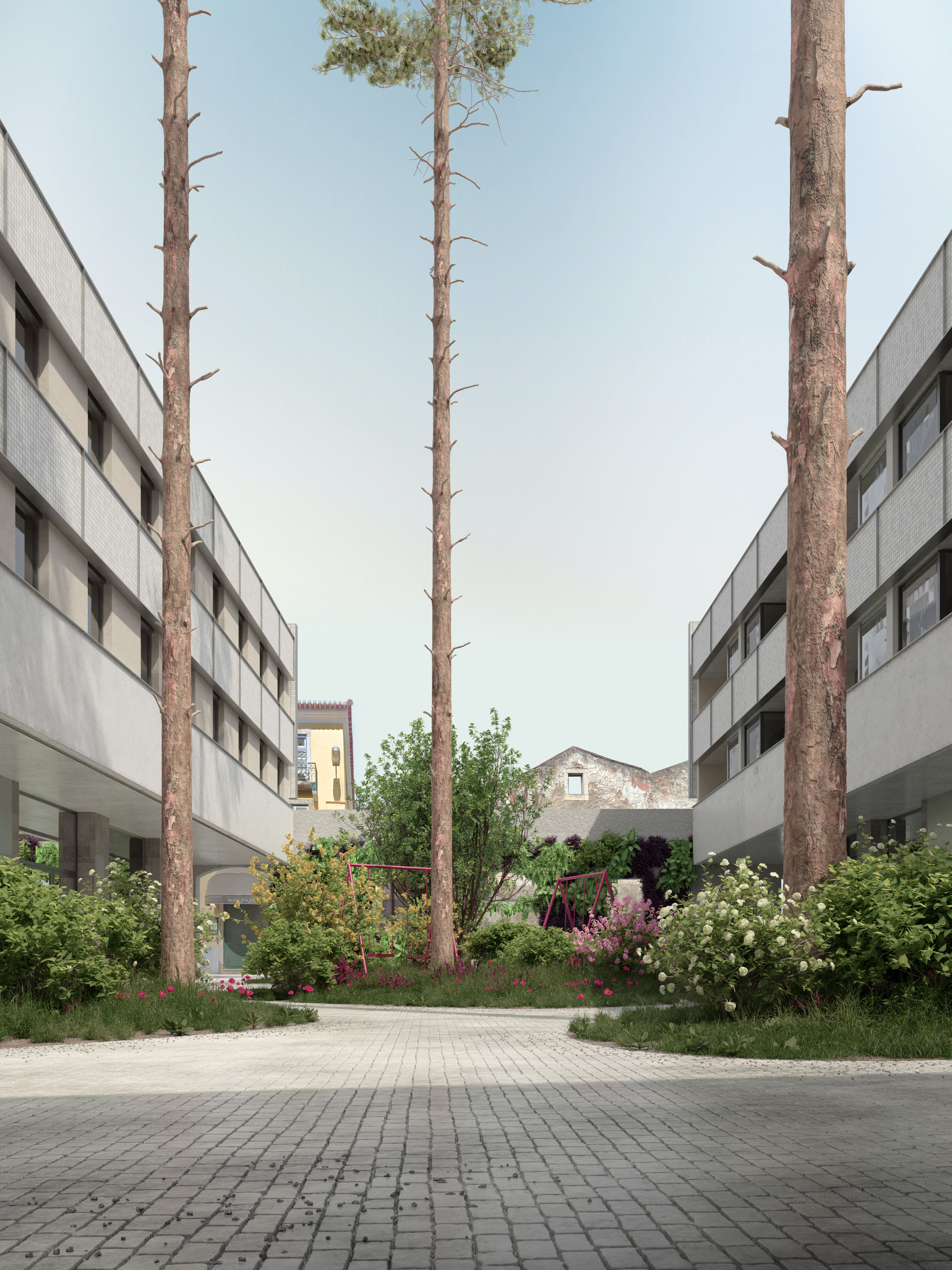 At the heart of the intervention lies the rehabilitation of the existing warehouse walls, which are preserved and reinterpreted. What once served as a boundary between public and private space is now redefined as a mediating element. These walls now articulate transitions between varying degrees of public exposure — on one side, the street and urban fabric; on the other, entrance courtyards and semi-private communal areas.
