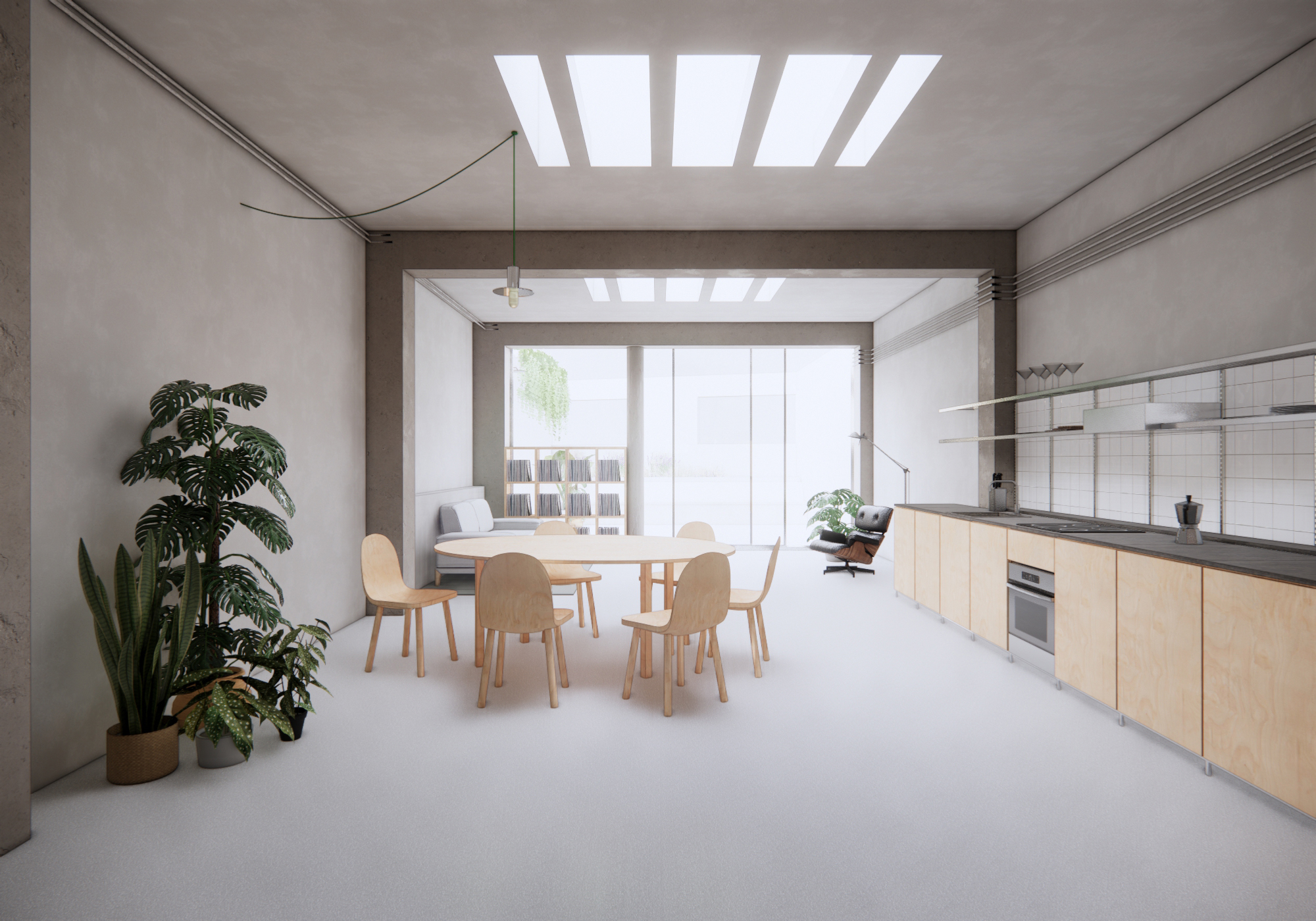The lower floor, facing a rear patio, contains the living areas: a lounge, kitchenette, bedroom, and bathroom. These spaces have been designed to provide comfort using limited resources, preserving original materials wherever possible — exposed masonry walls, existing flooring, and visible metal structures — reinforcing the character of the pre-existing building.