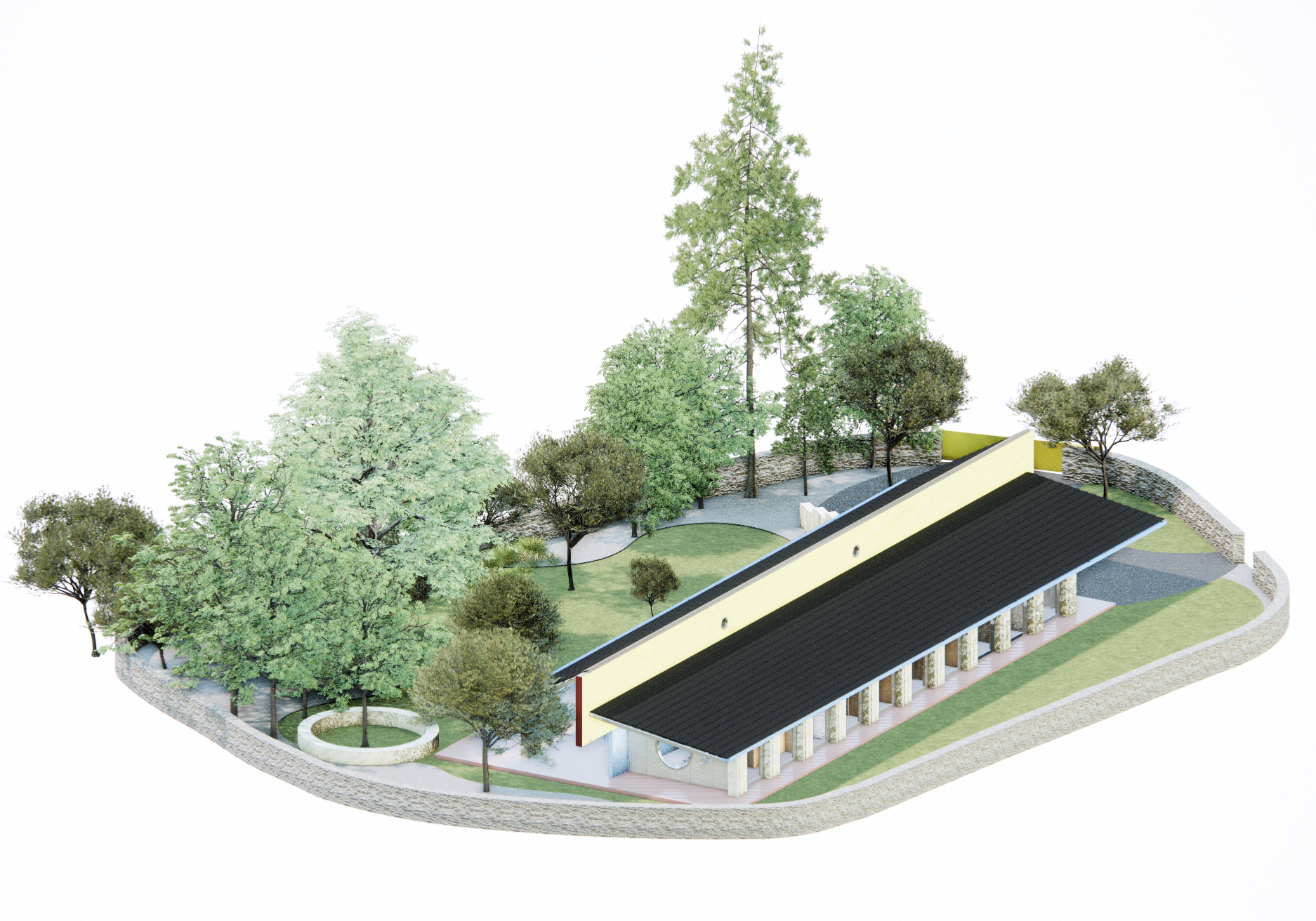 Set on a circular plot, bordered by road on almost its entire perimeter, this single-storey dwelling stems from a direct reading of the site and its local building practices. The proposal reclaims vernacular elements — stone walls, timber roof structure, and traditional ceramic tiles — reinterpreting them with precision and without artifice, through an essential architectural gesture.