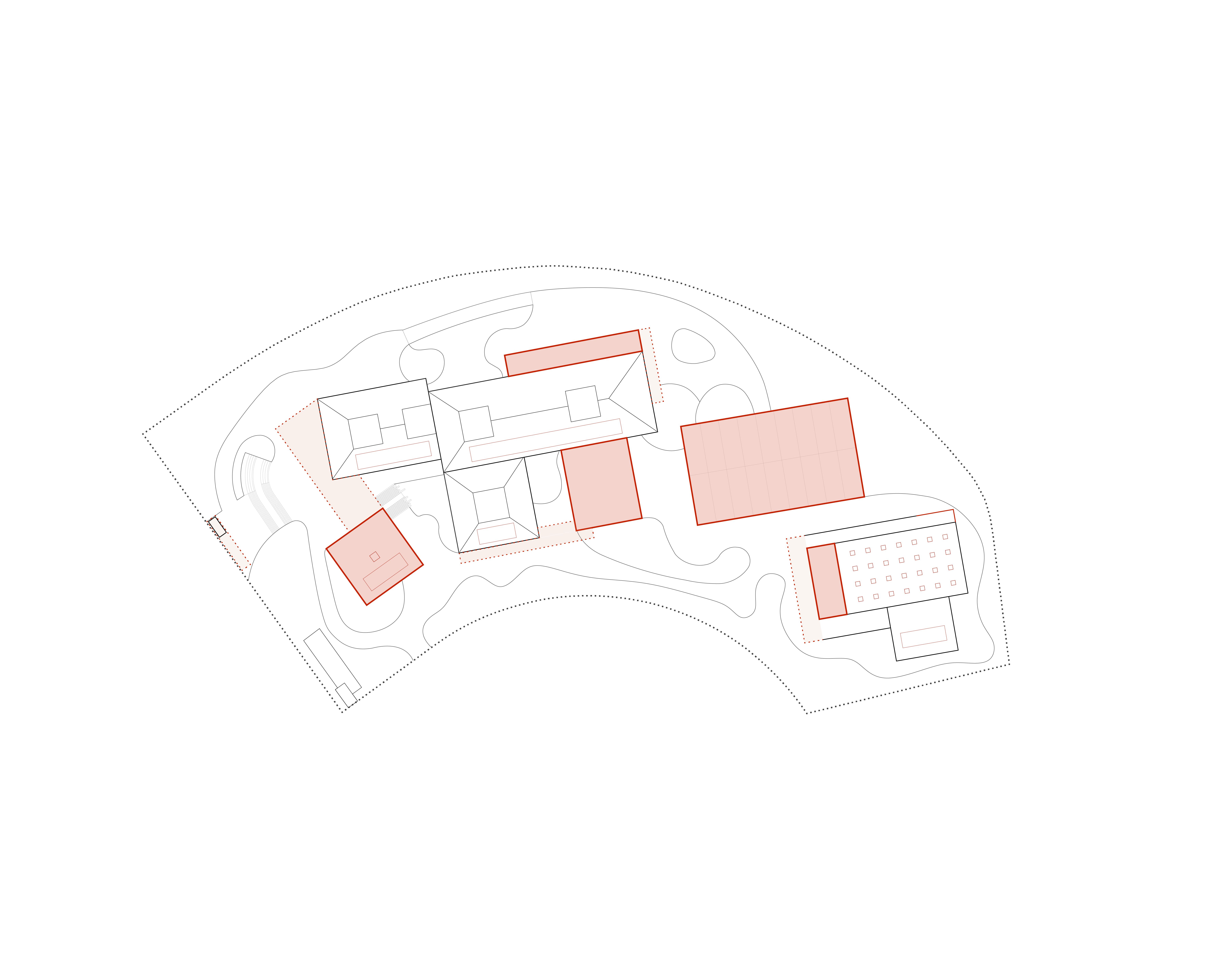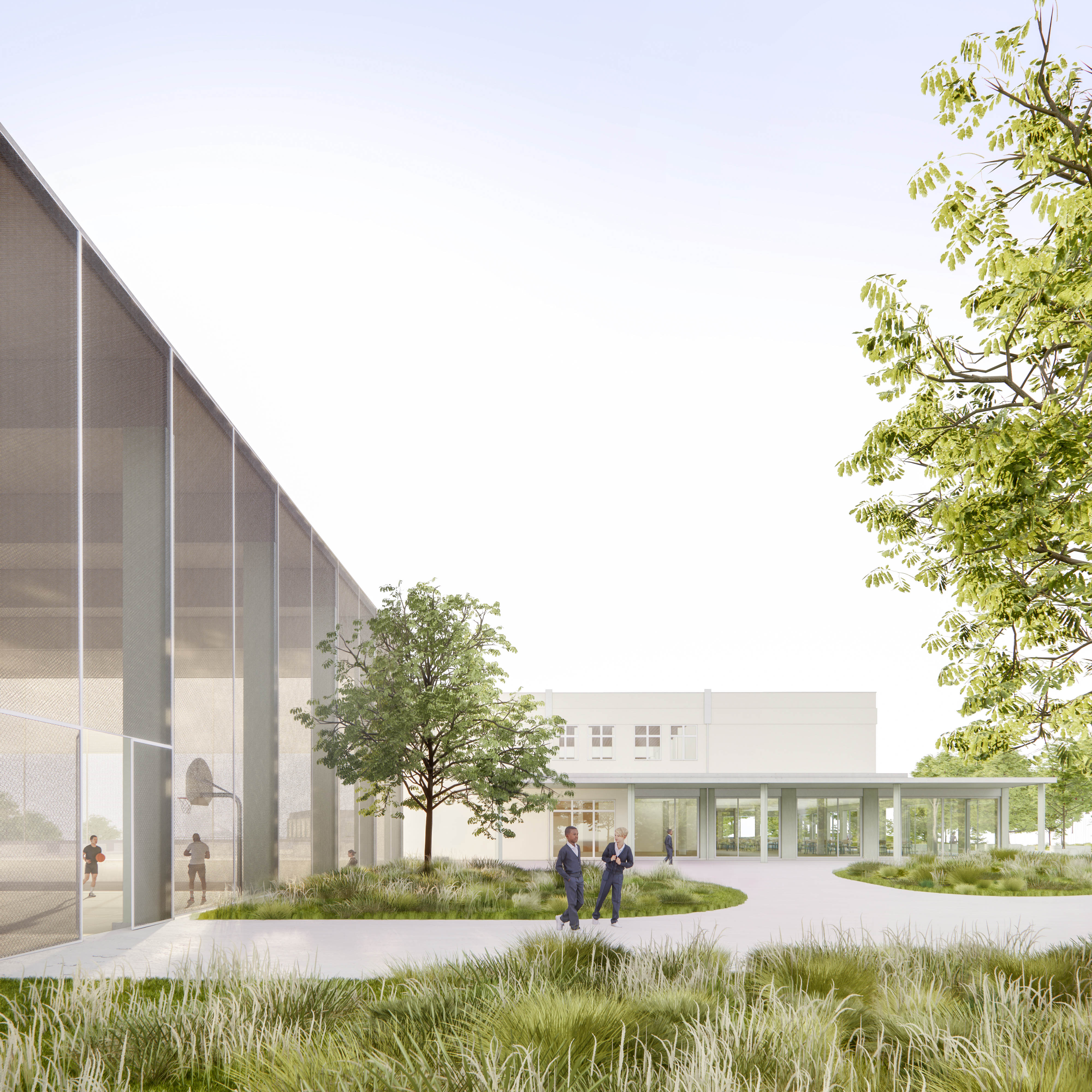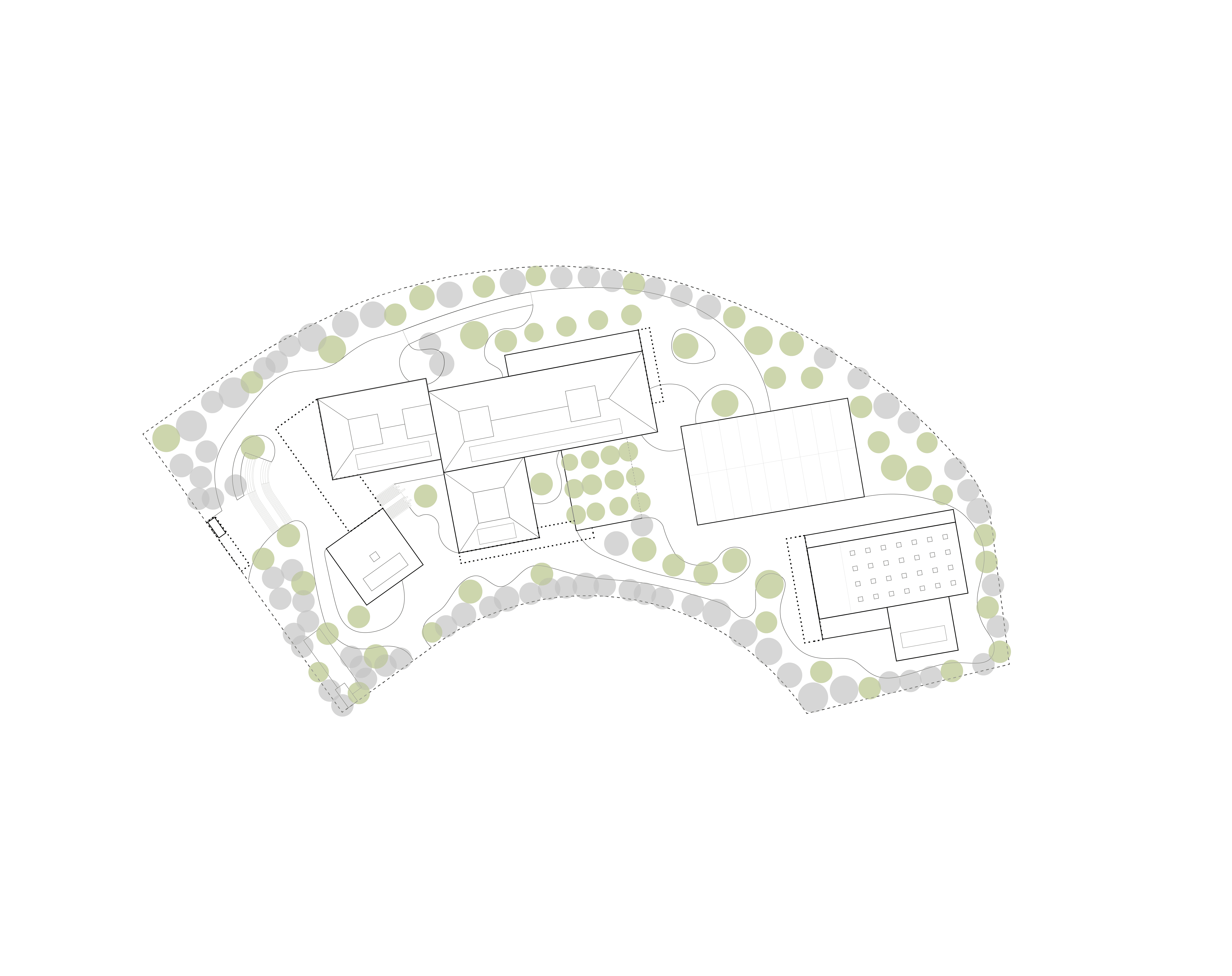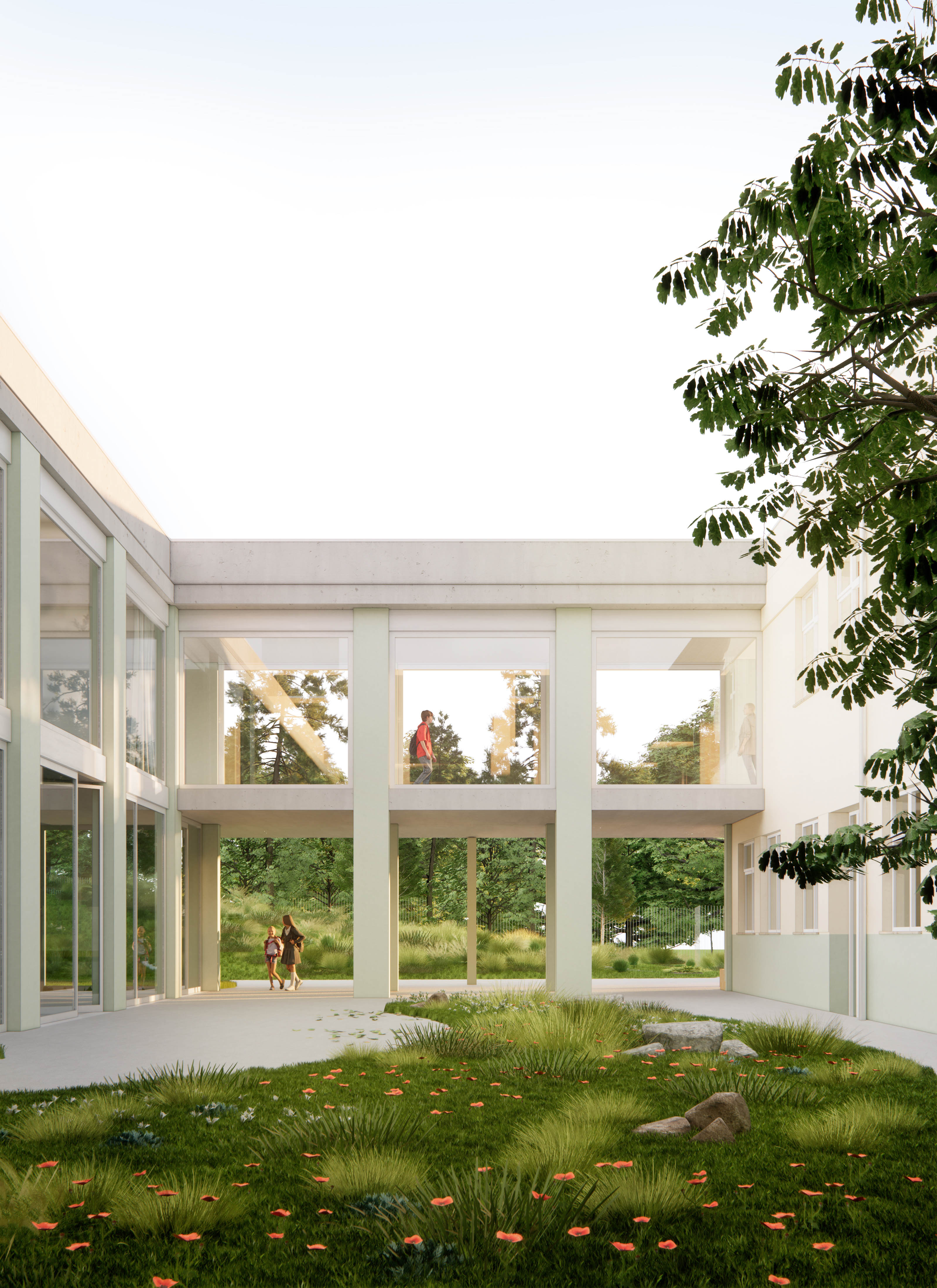 The landscape strategy aims to create a sustainable and pleasant environment, eliminating physical and visual barriers and introducing organic curves and continuous green zones. Gardened areas along the plot boundaries ensure greater privacy for the school’s central core and strengthen its integration into the surrounding context.