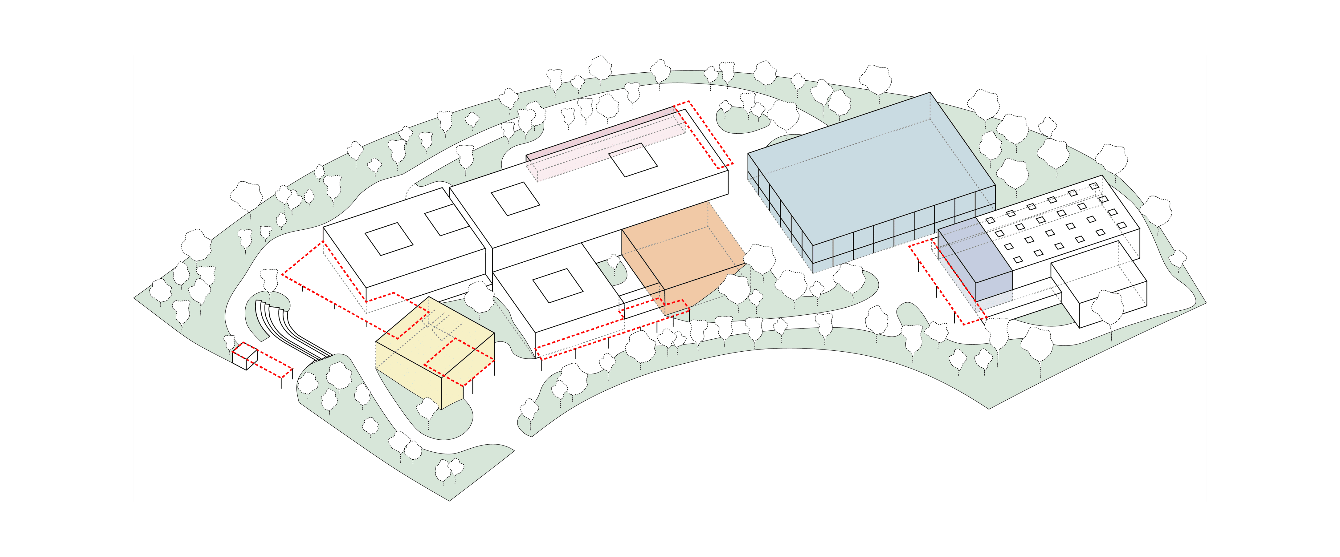 The new buildings address contemporary educational needs by creating additional recreational areas (both covered and open-air) and promoting fluid circulation across all spaces, unifying the school as a cohesive whole. The compact structure of the new volumes enables efficient management of movement and clarifies the school’s overall spatial and programmatic organisation.