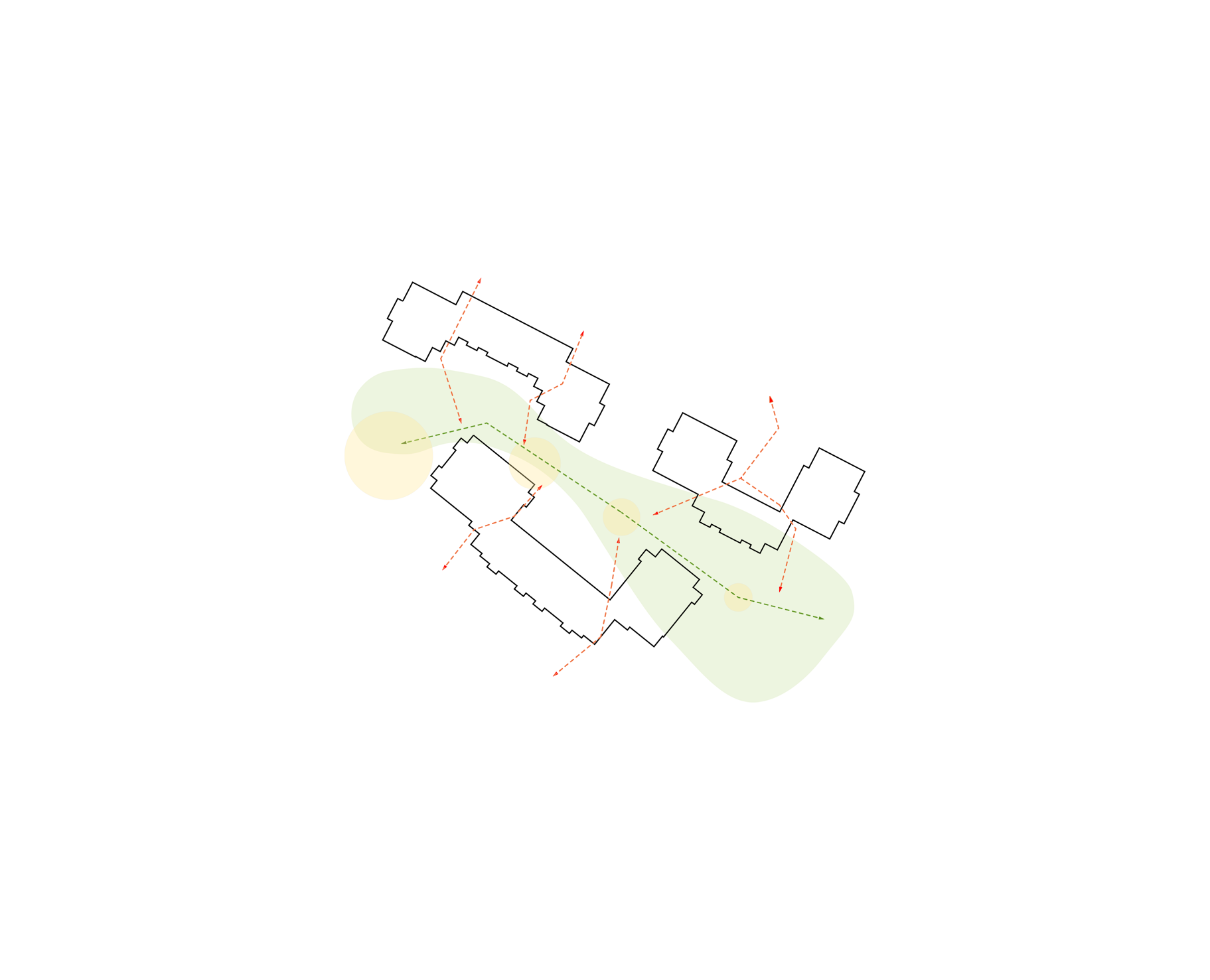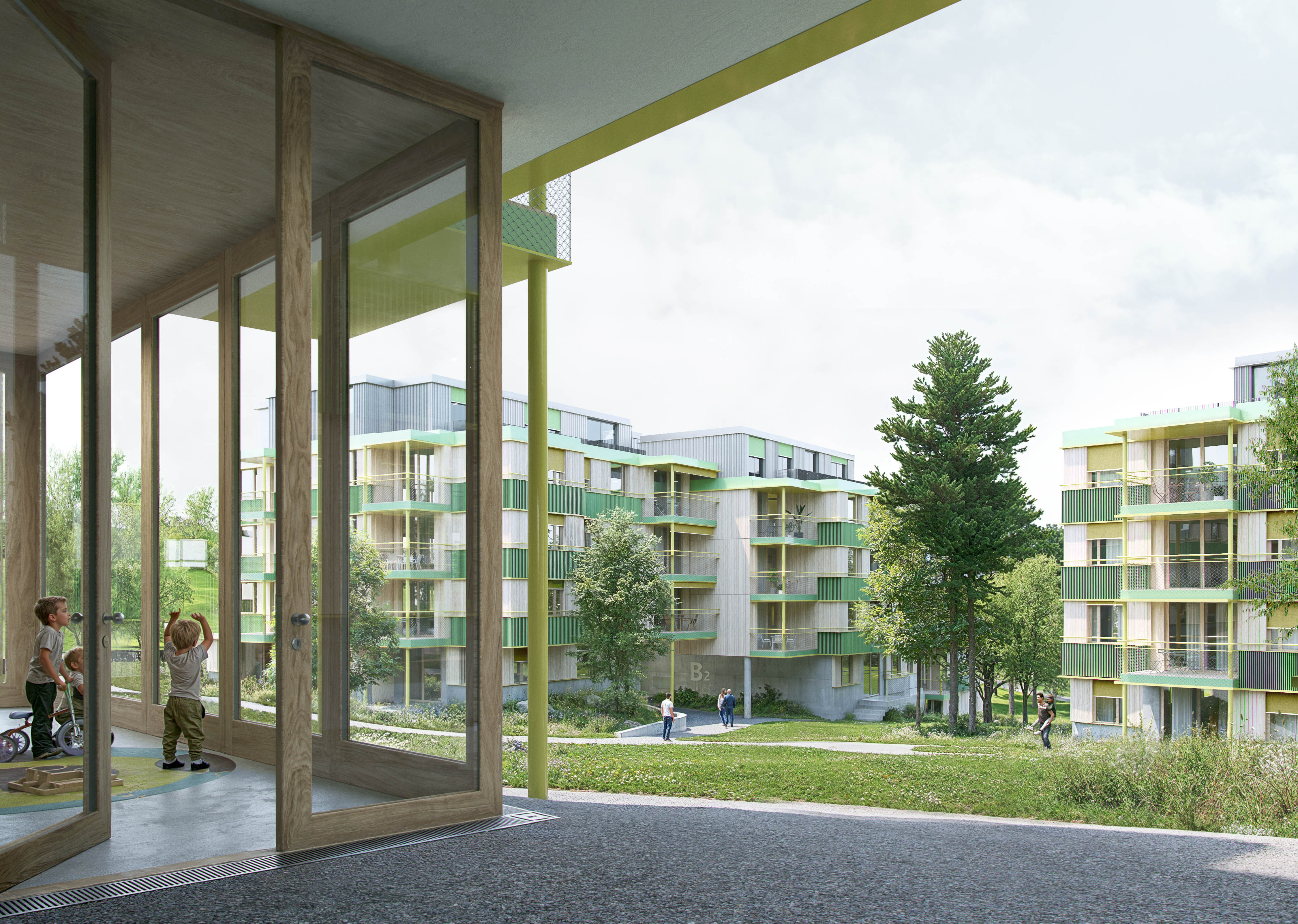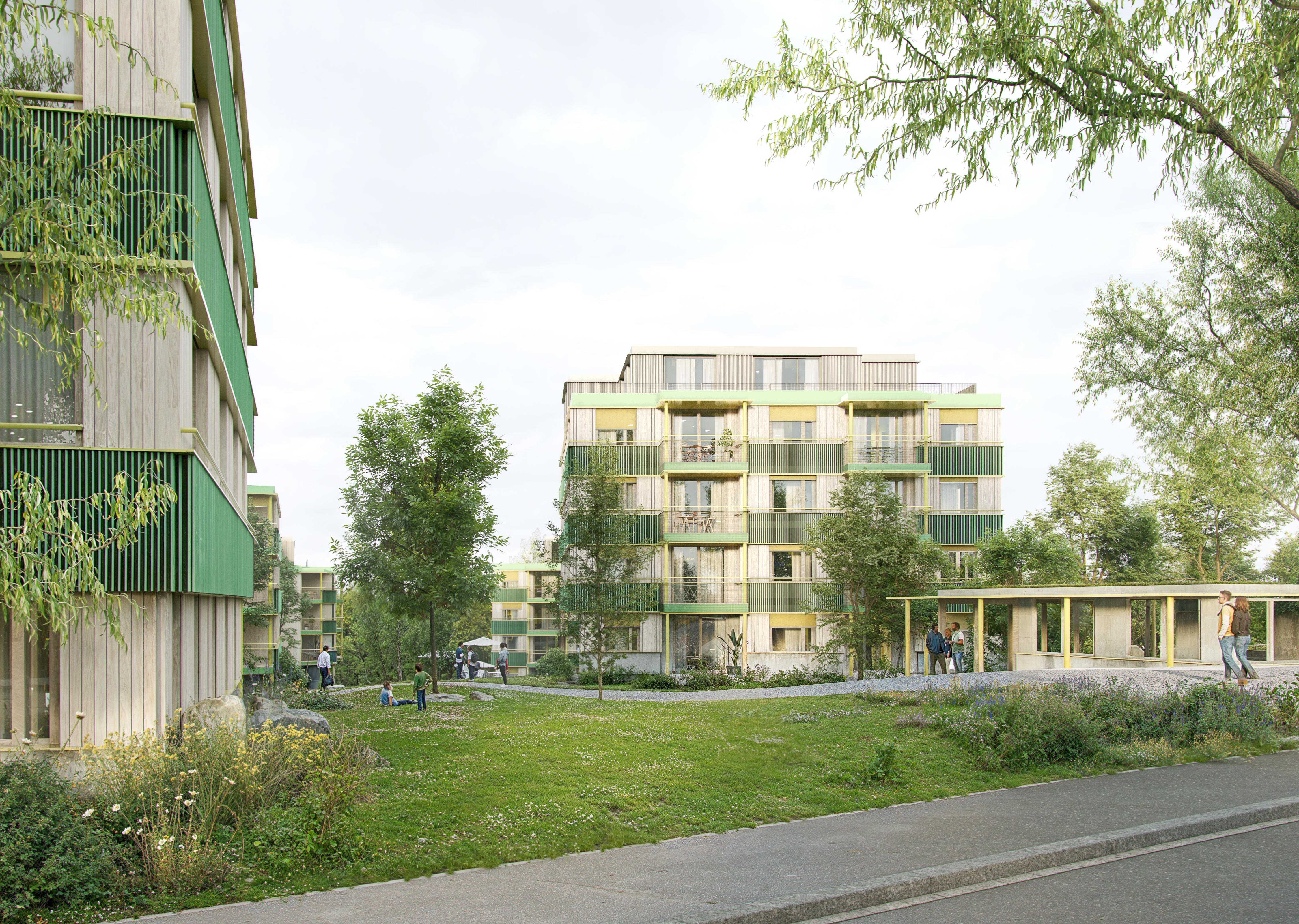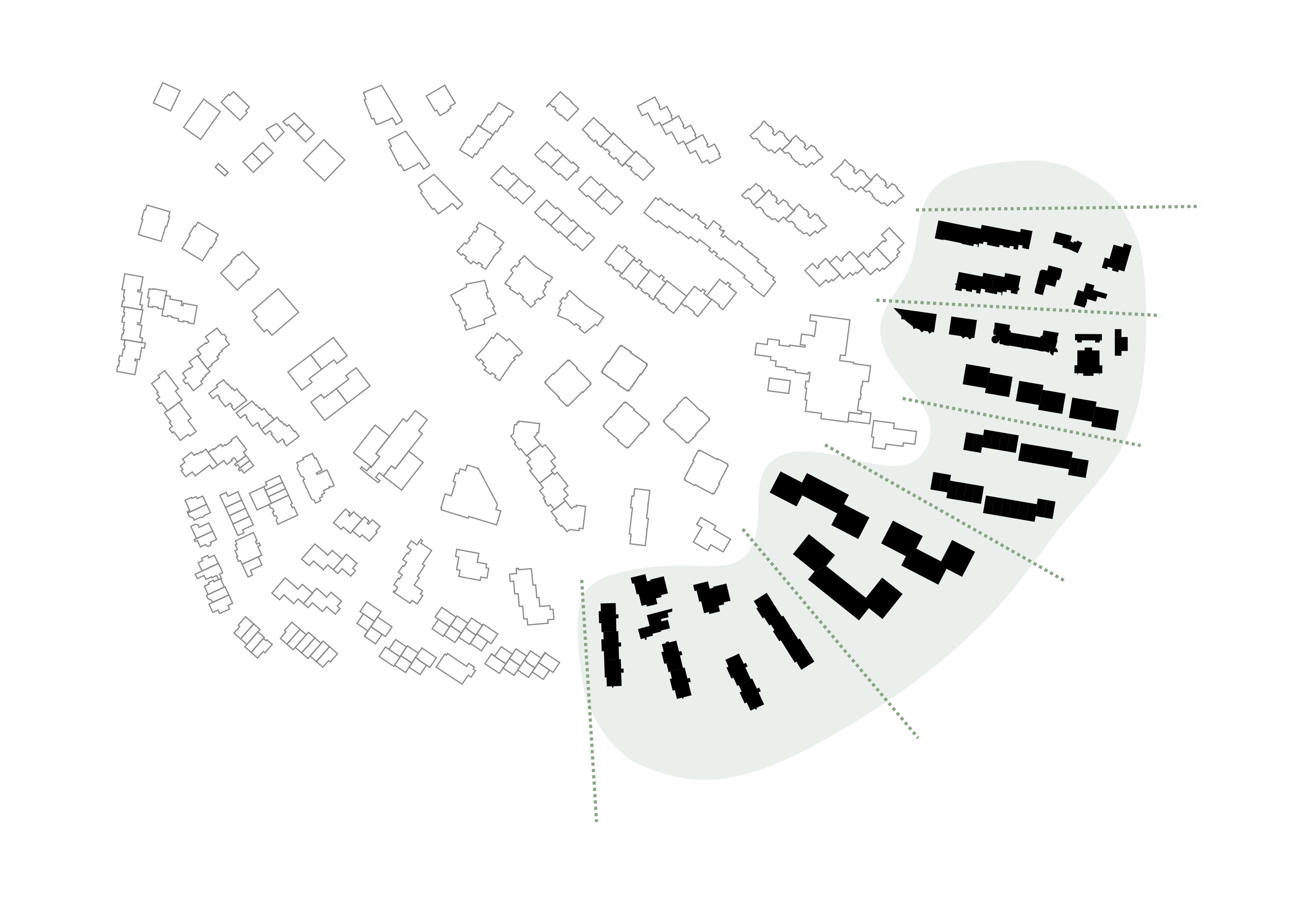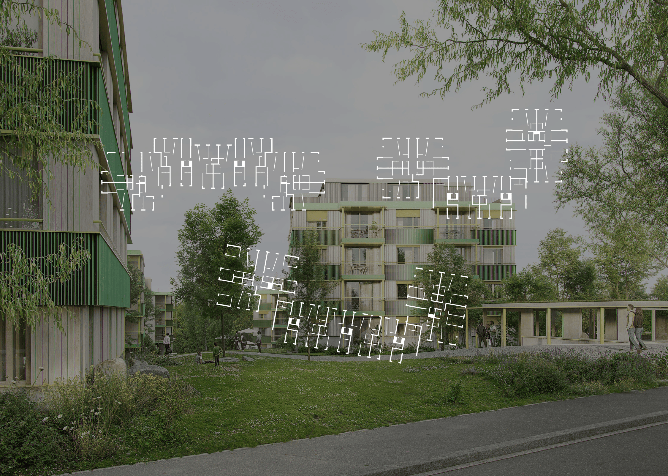 In the suburbs of Zurich, adjacent to the forest and on sloping terrain, we were commissioned to develop 160 cross-ventilated apartments. To preserve the existing vegetation as much as possible and ensure permeability between the buildings, the proposal is organised as a cluster of volumes delicately inserted into the topography. The ground floor is activated by dwellings in direct contact with the soil, integrated into a continuous garden that links the city to the park — a gesture reinforcing the idea of a boundless city, fostering coexistence with nature.