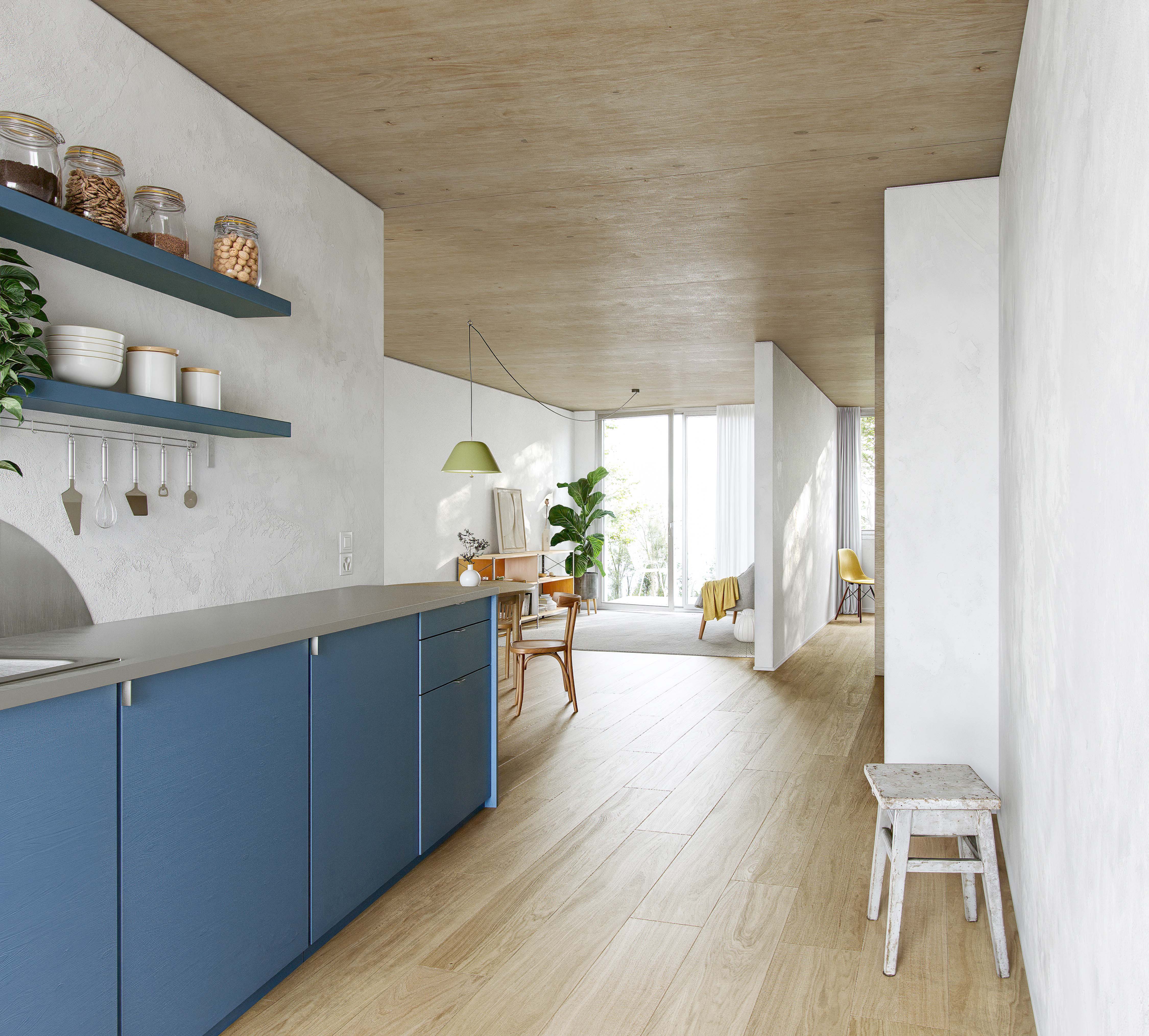 The construction is based on a laminated timber structure set atop a concrete base, which houses the underground car park. Each building comprises four storeys and a setback top floor, ensuring a scale appropriate to the site.