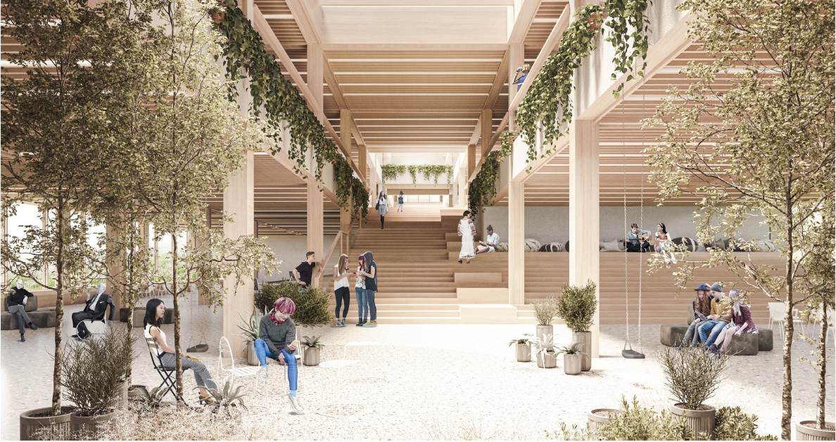 The site's configuration generates functional terraces with direct access, enabling the extension of activities outdoors. These exterior areas are organised by functional group — including separate playgrounds, a sports field, and a garden — ensuring both programmatic separation and suitability for each activity.