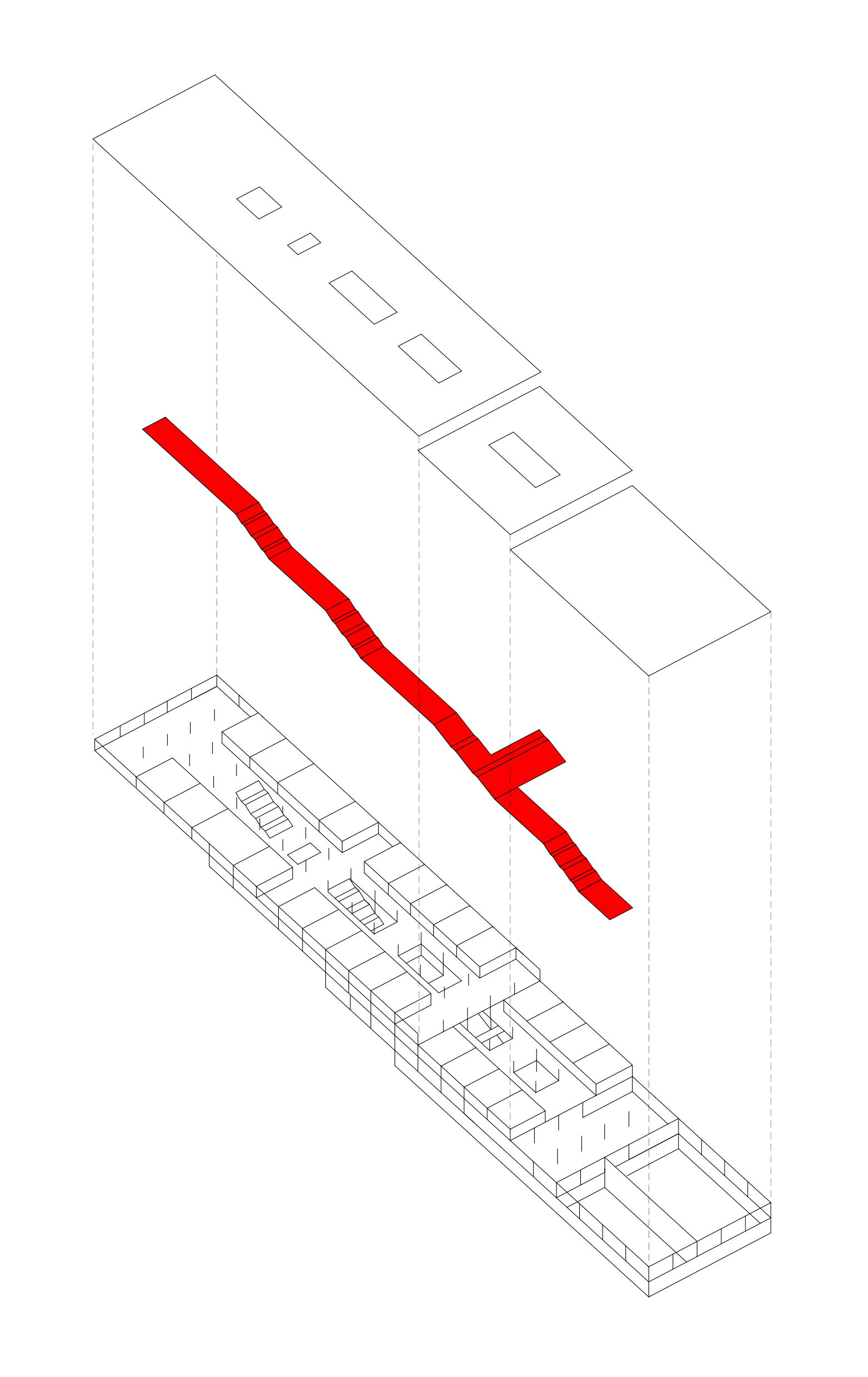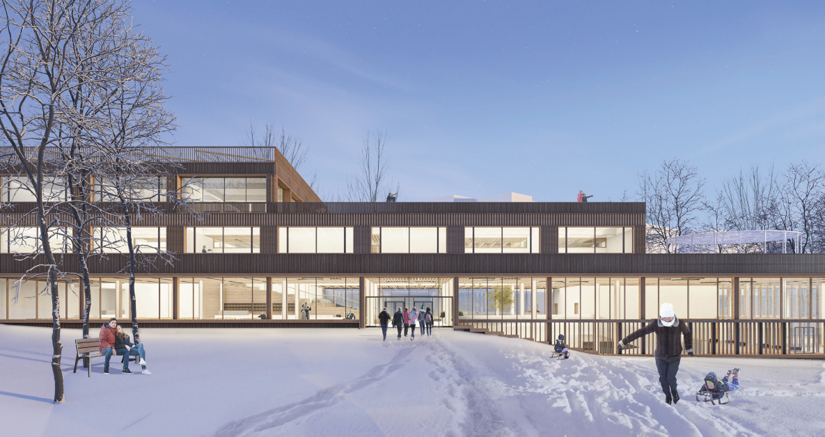 The architectural solution is based on a clear volumetric composition, with three blocks differentiated by function and elevation. The upper volume houses the kindergarten and part of the primary school; the middle block accommodates the remainder of the school programme; and the lower block contains public-use facilities such as the sports hall, swimming pool, and auditorium.