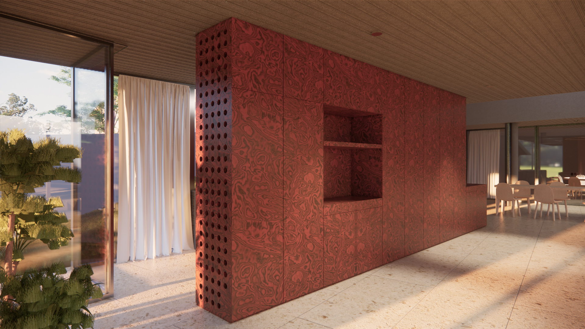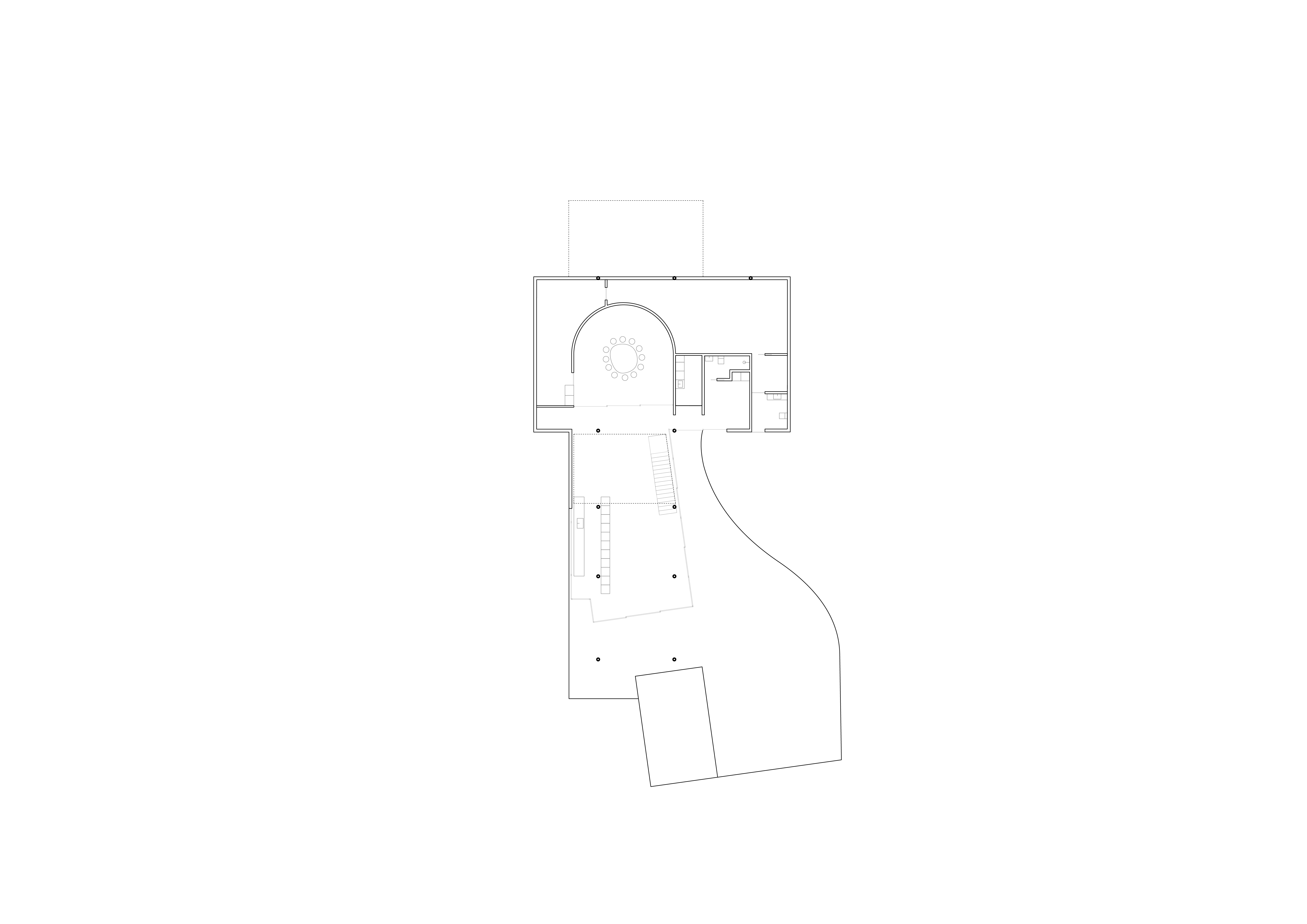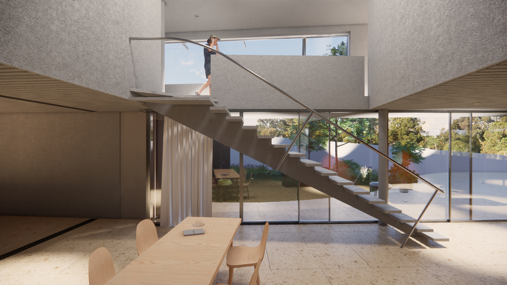 Access is from the upper level, where parking is located. Along the longitudinal axis, a precise volume unfolds, organising the bedrooms and library, distancing these private functions from the social areas of the house.