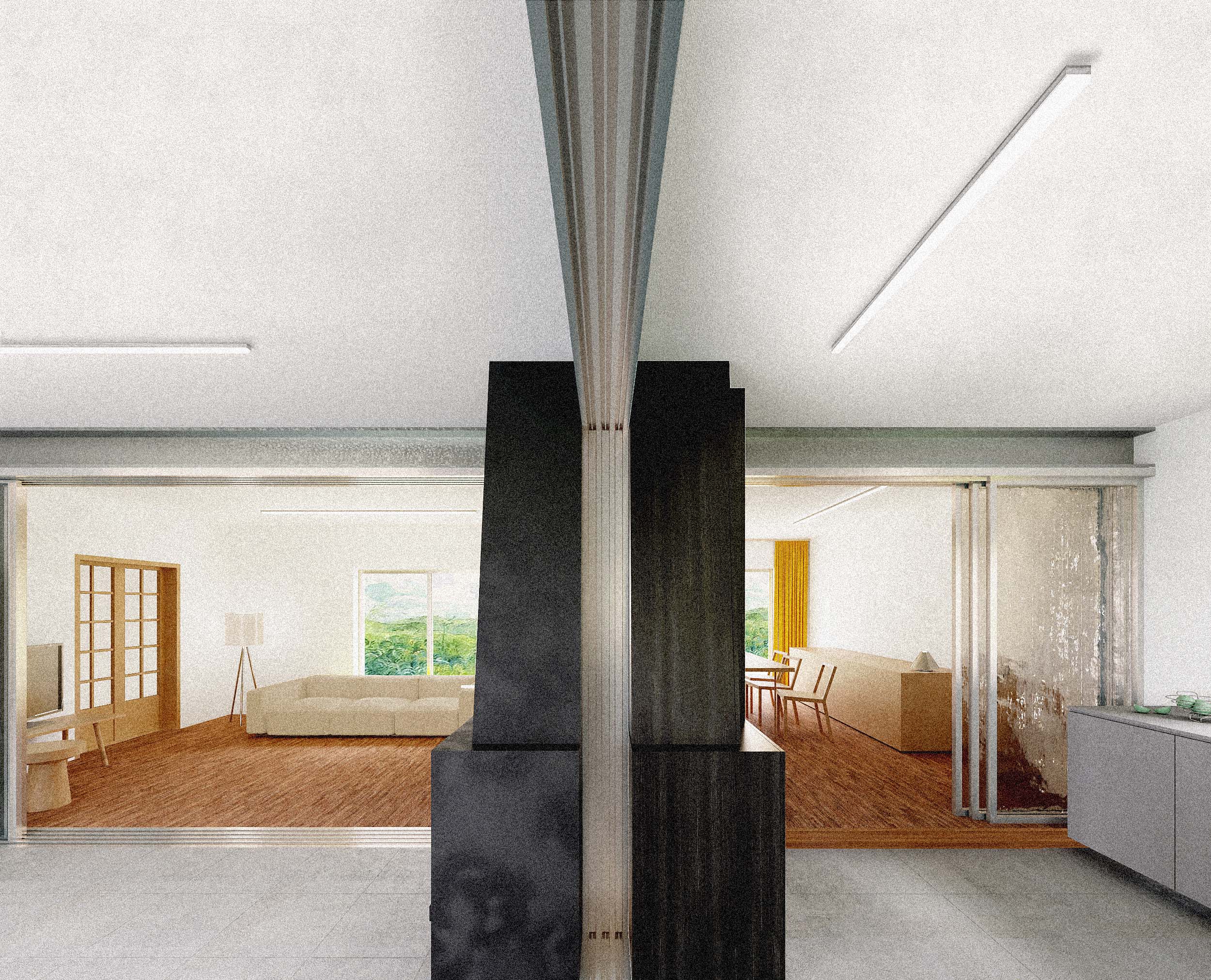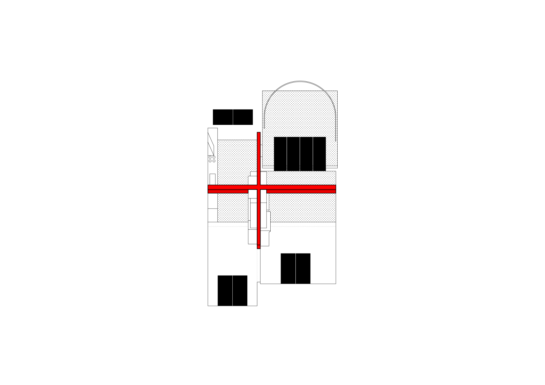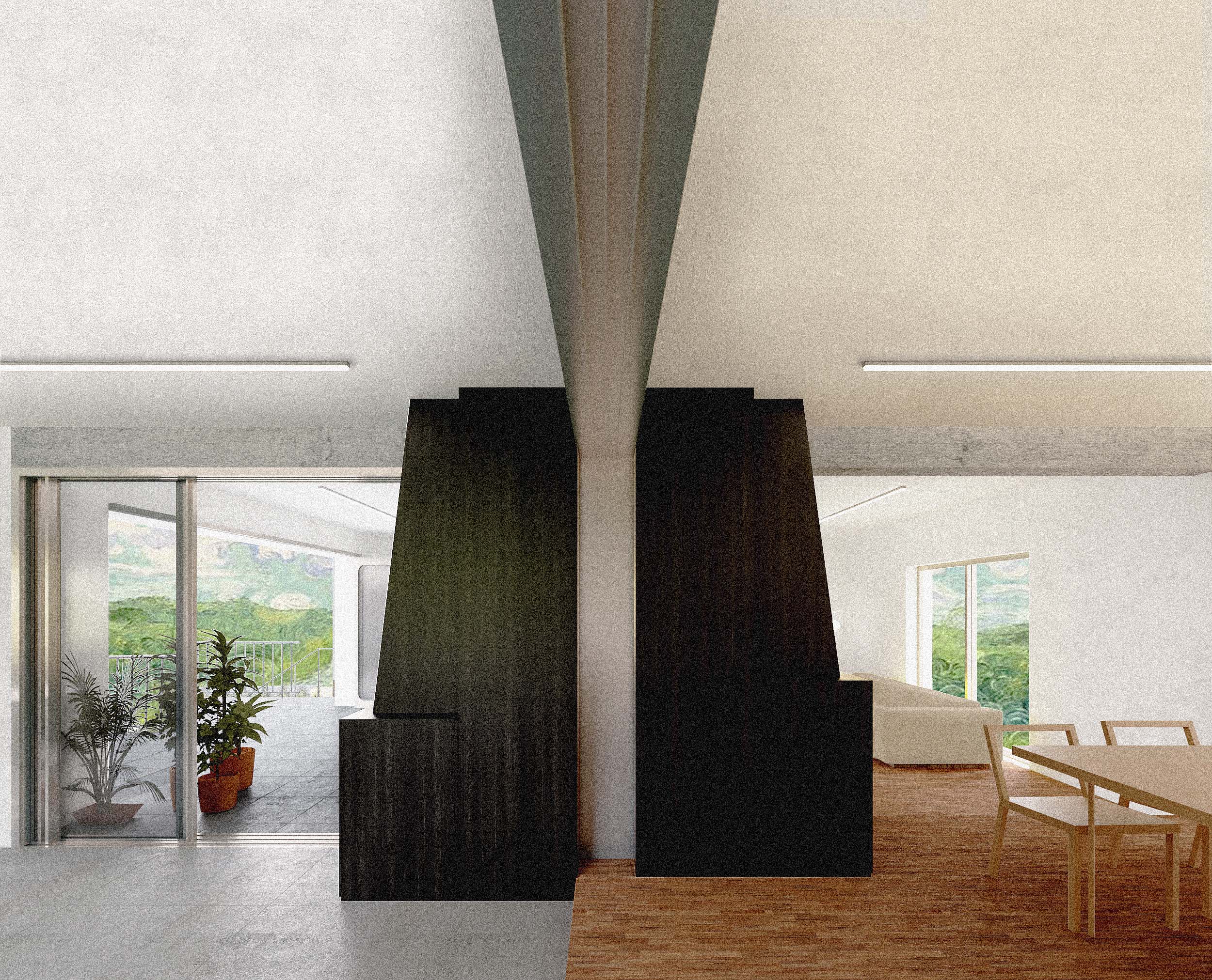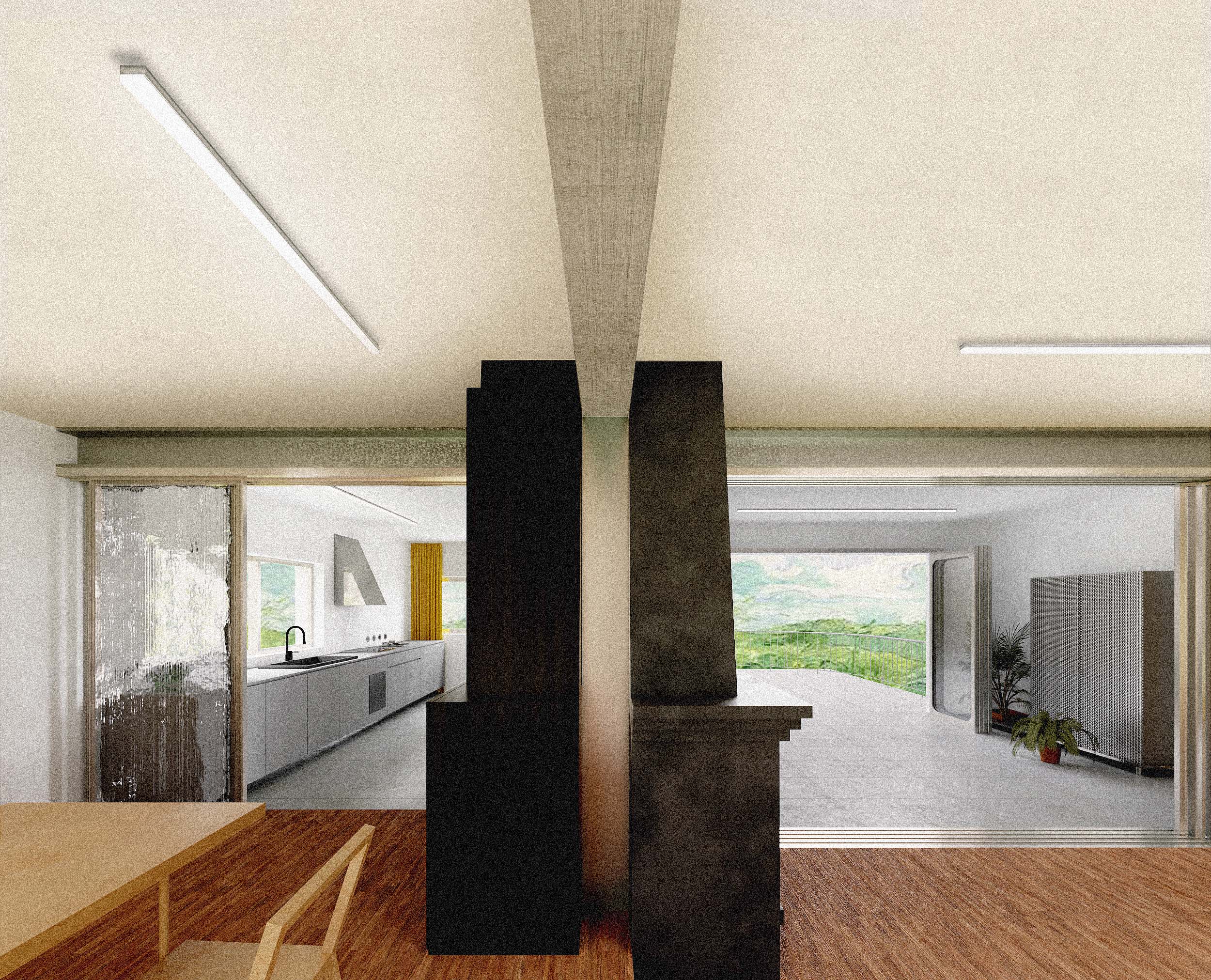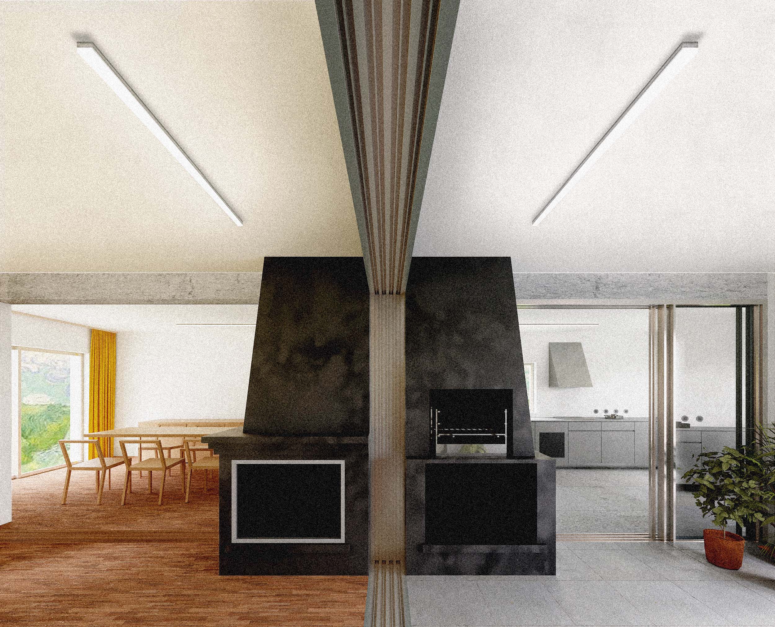 This was precisely the starting point for this intervention: to transform a chaotic house into a functional, compact, and coherent space. The operation is based on a central gesture: the creation of an essential core — a four-faced volume that organises daily life. Fireplace, barbecue, storage, and utility — all concentrated in this single element that is both utilitarian and symbolic. The centre, the hearth, the meeting point.