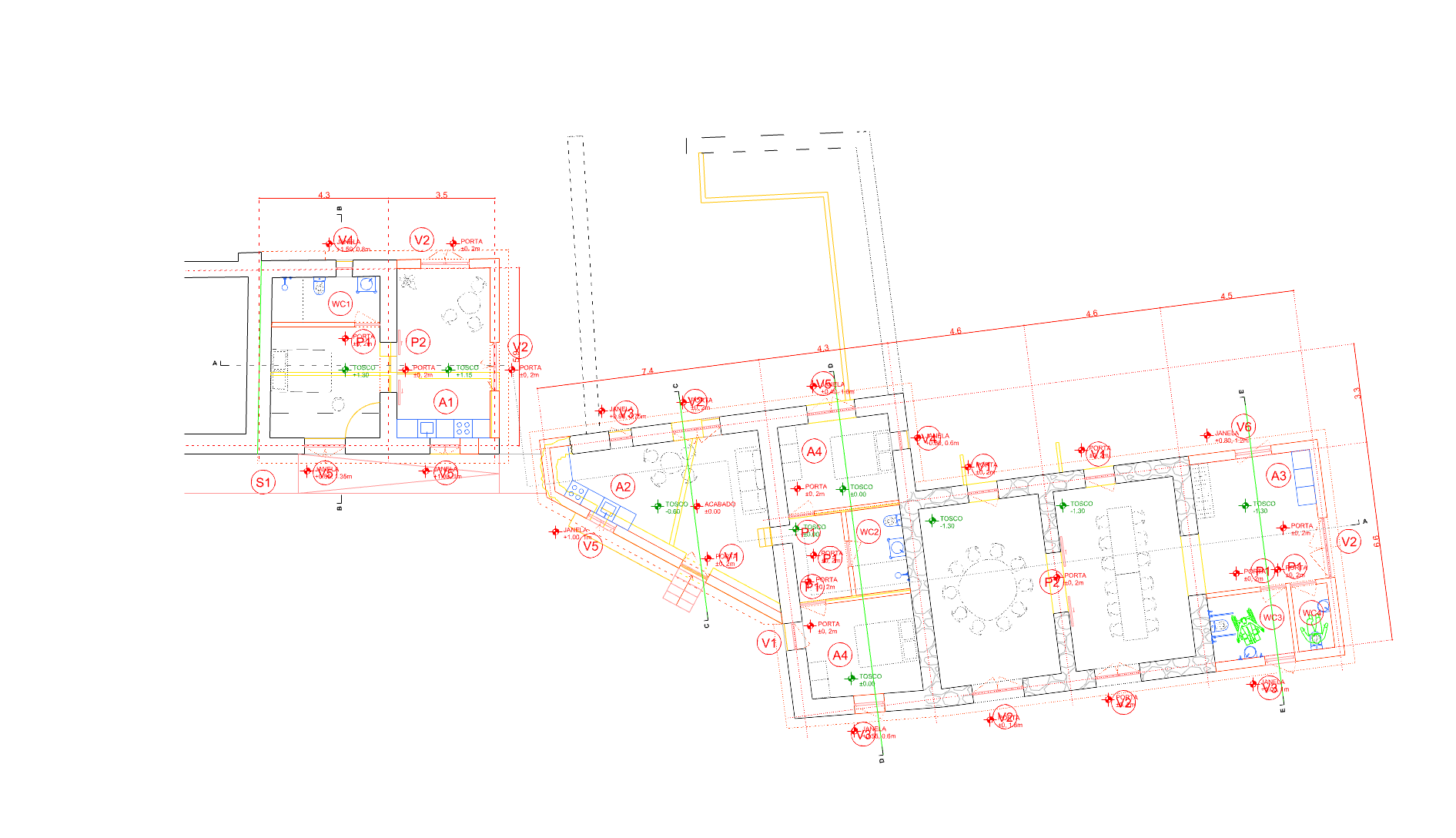 The larger houses are reconfigured into small guest accommodation units; derelict outbuildings are demolished; the former animal pens are transformed into spaces for collective use. At the southern edge of the property, overlooking the Douro River, a small campsite is integrated into the landscape — discreet and quiet.