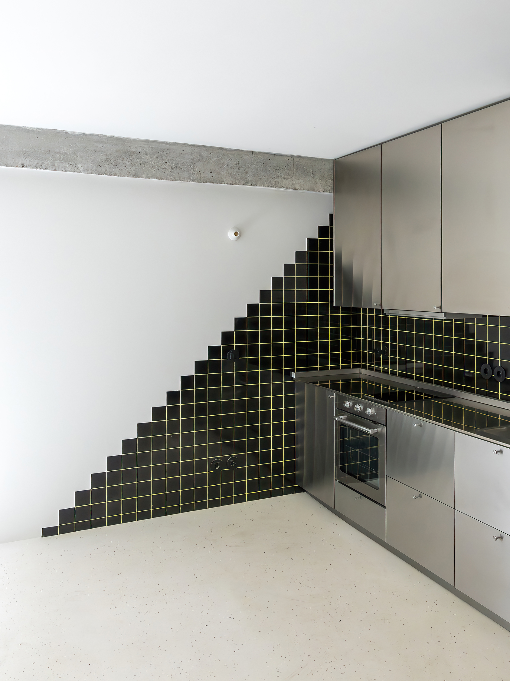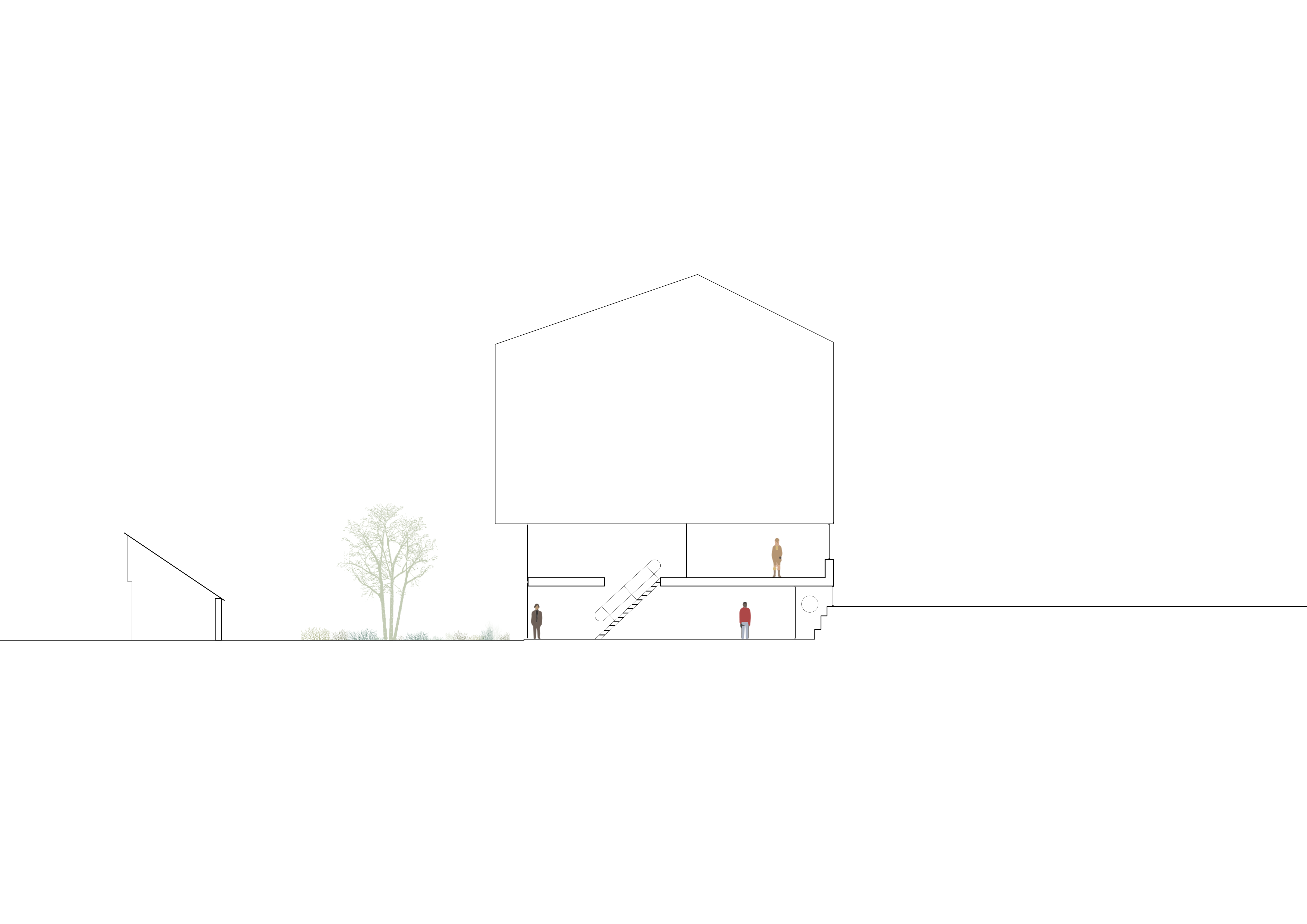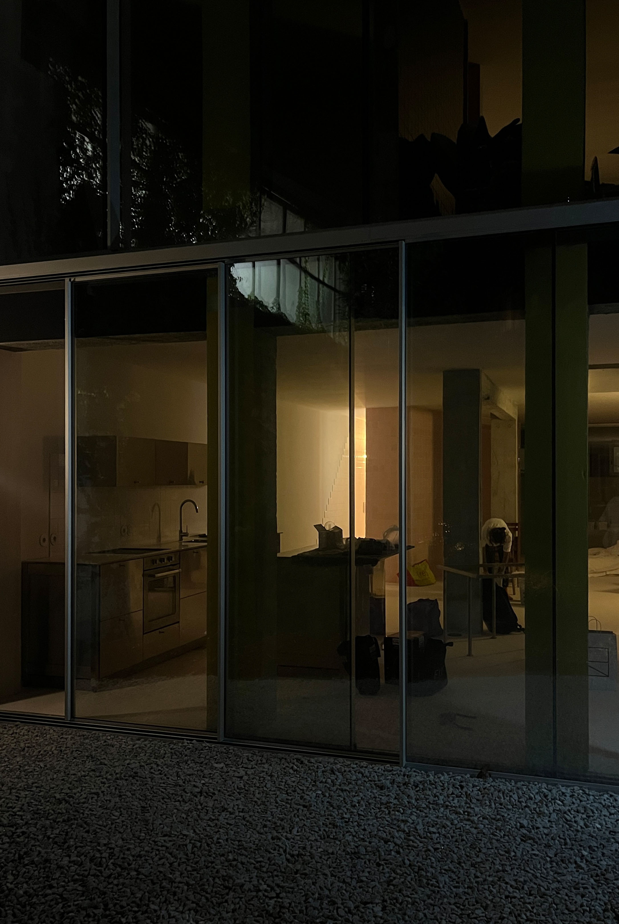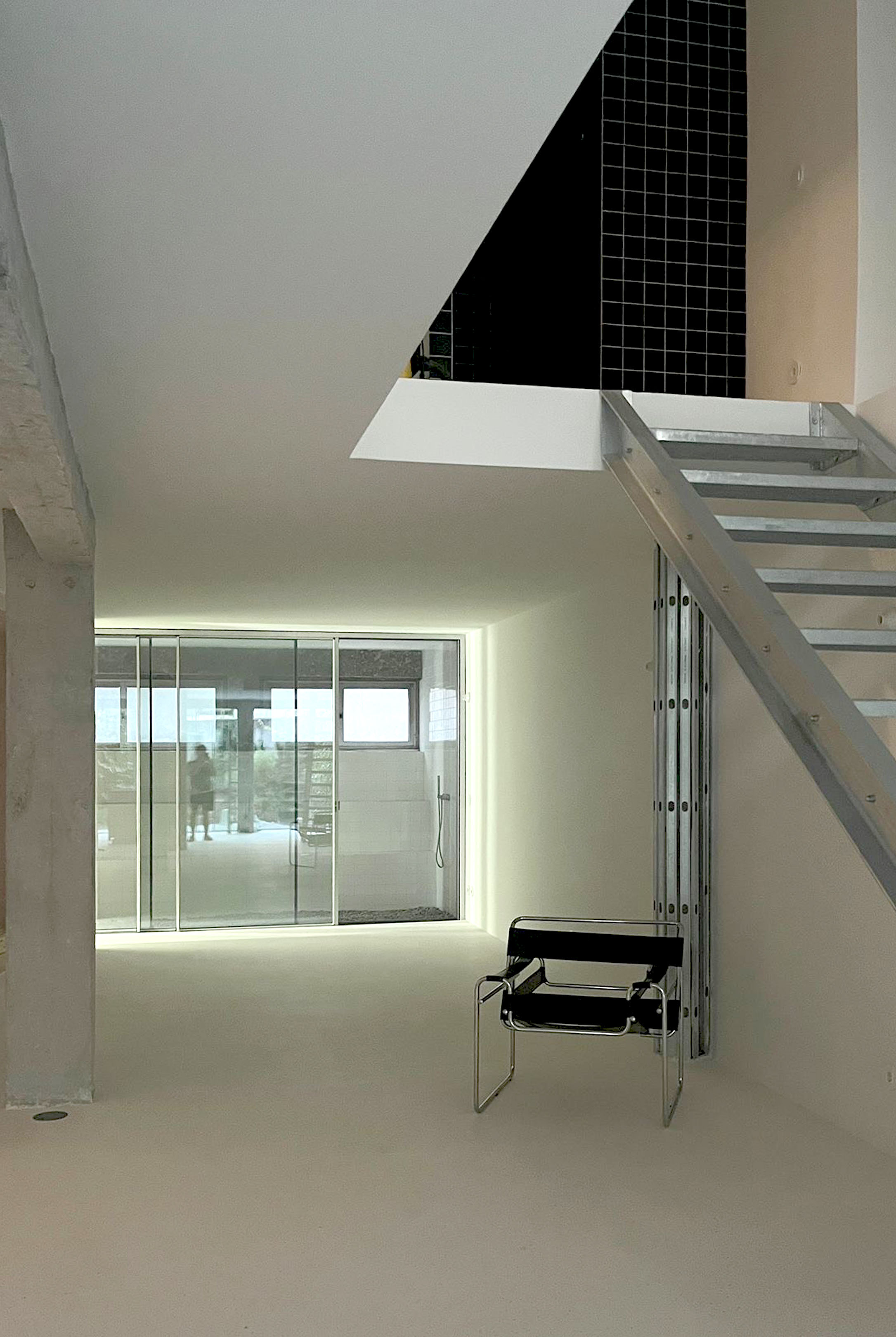 O lote deu lugar a duas habitações: uma unidade frontal — um estúdio compacto com instalação sanitária — e uma casa principal em duplex, voltada ao jardim. No piso superior, localizam-se o quarto e o escritório; no piso inferior, um salão longitudinal estende-se entre dois pátios, permitindo uma vivência contínua entre interior e exterior. Um único objeto central organiza o espaço e incorpora múltiplas funções do programa — arrumação, circulação e divisões técnicas.