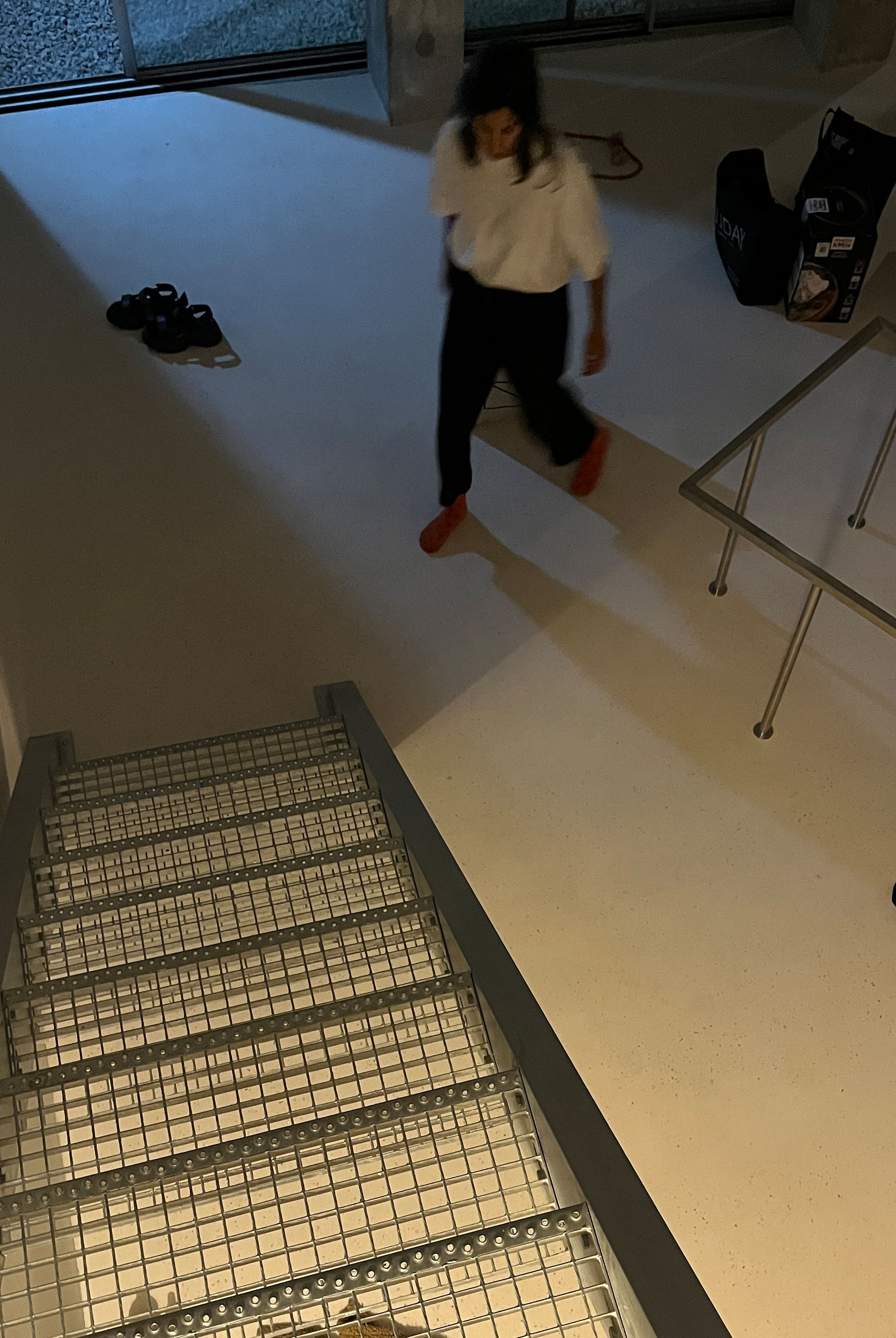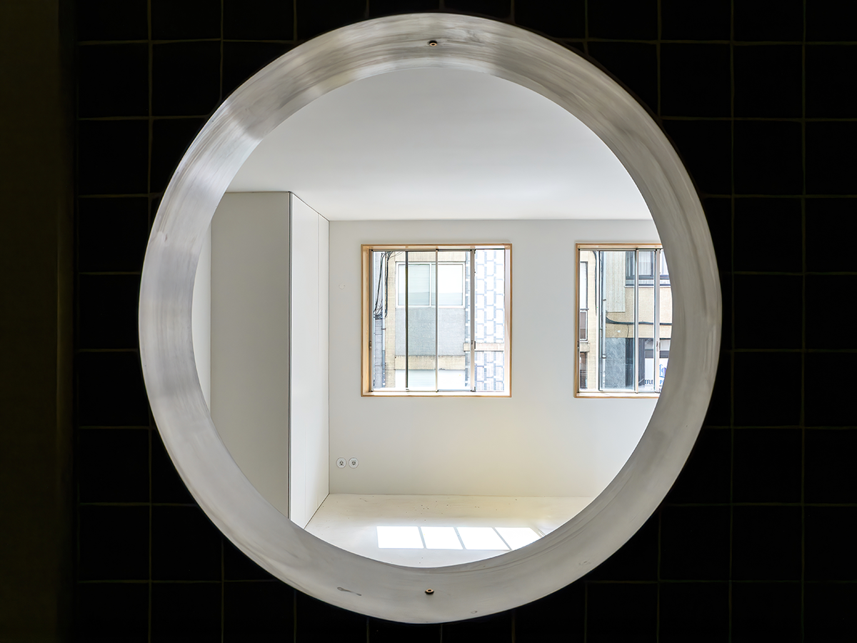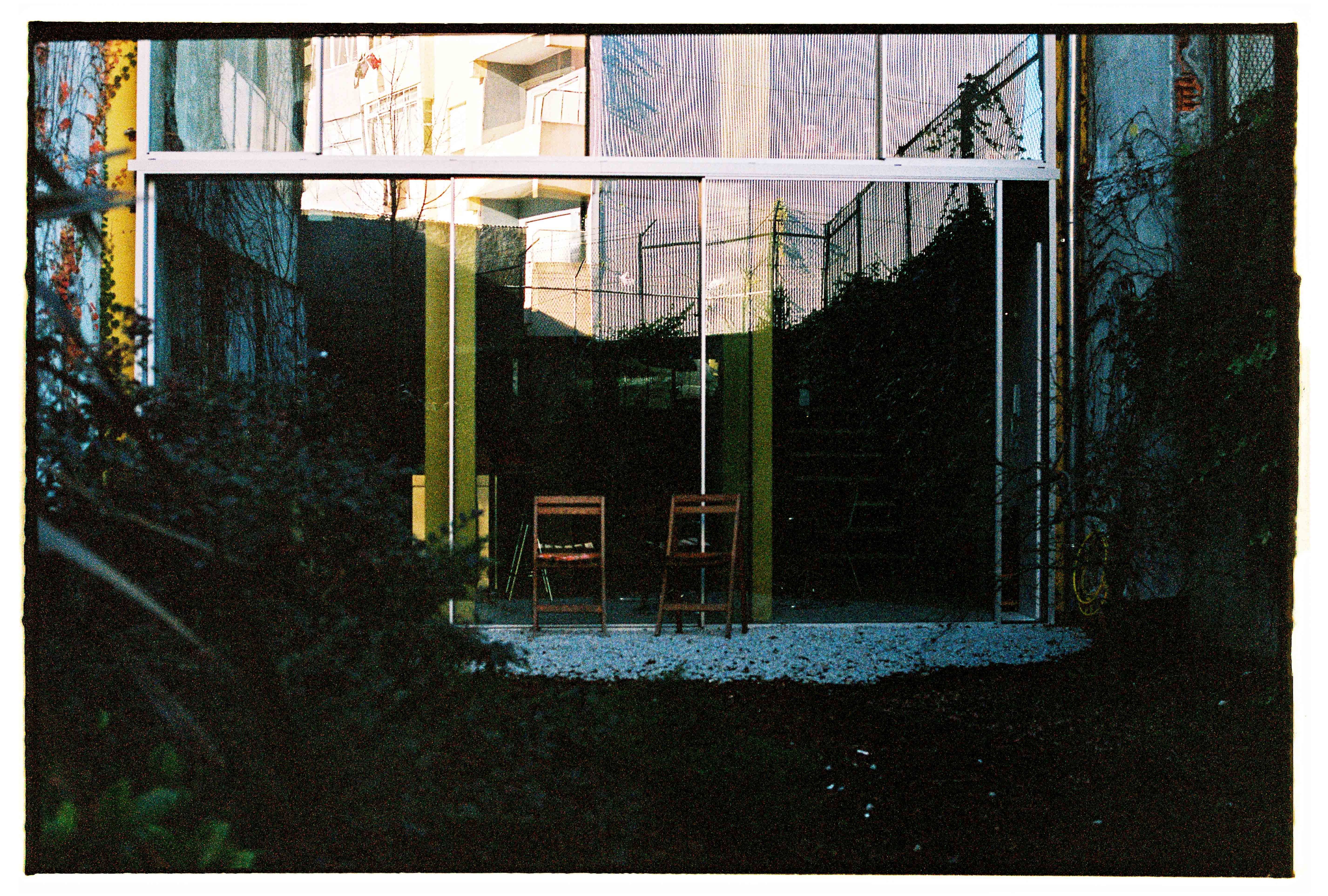 O lote deu lugar a duas habitações: uma unidade frontal — um estúdio compacto com instalação sanitária — e uma casa principal em duplex, voltada ao jardim. No piso superior, localizam-se o quarto e o escritório; no piso inferior, um salão longitudinal estende-se entre dois pátios, permitindo uma vivência contínua entre interior e exterior. Um único objeto central organiza o espaço e incorpora múltiplas funções do programa — arrumação, circulação e divisões técnicas.