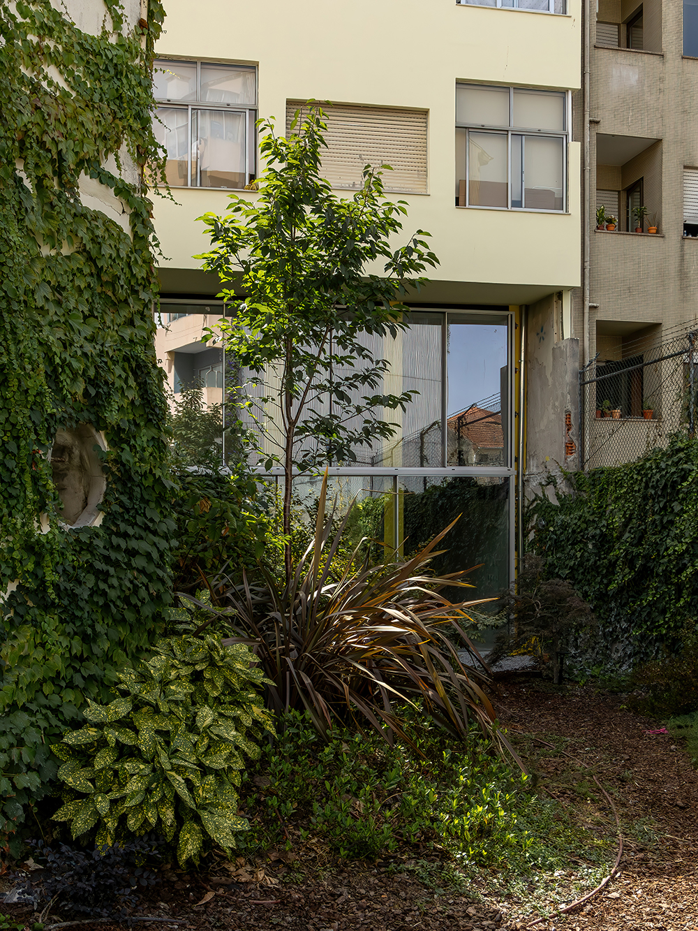 O que antes funcionava como um escritório farmacêutico foi reconvertido em habitação. A intervenção tira partido da cota elevada do piso térreo em relação à rua, enquanto a cave se abre para um amplo pátio em betão. As demolições parciais foram utilizadas estrategicamente para modelar o terreno e introduzir variações topográficas — uma tentativa de trazer um fragmento do monte para o interior da malha urbana.