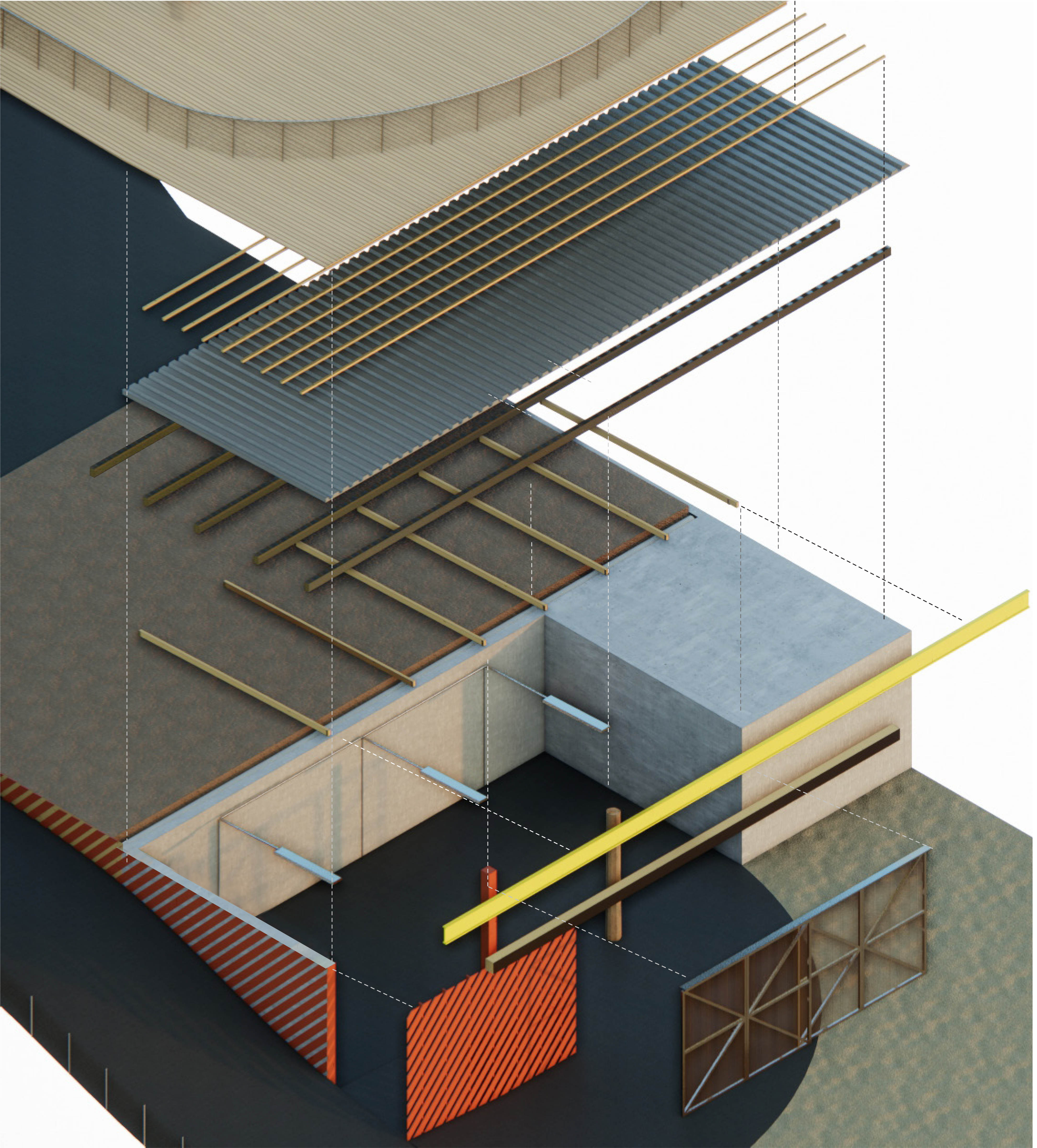 O interior do pavilhão integra uma cozinha de apoio, concebida com técnicas construtivas locais: estrutura em betão armado, lajes com vigotas e acabamentos simples e robustos. A escolha destes sistemas construtivos visa garantir durabilidade, facilidade de execução e compatibilidade com mão de obra local.